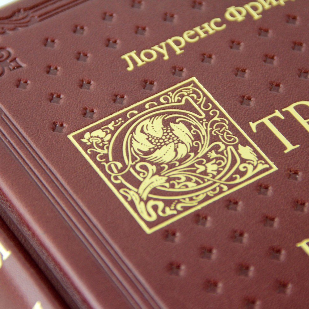 Исполнение: Переплёт ручной работы из натуральной кожи. Форзац из дизайнерской бумаги. 2 бинта на корешке, ручной обработки. Обрез блока закрас с торшонированием золотом. Тиснение блинтовое и золотой фольгой. Каптал из натуральной кожи. Ляссе.