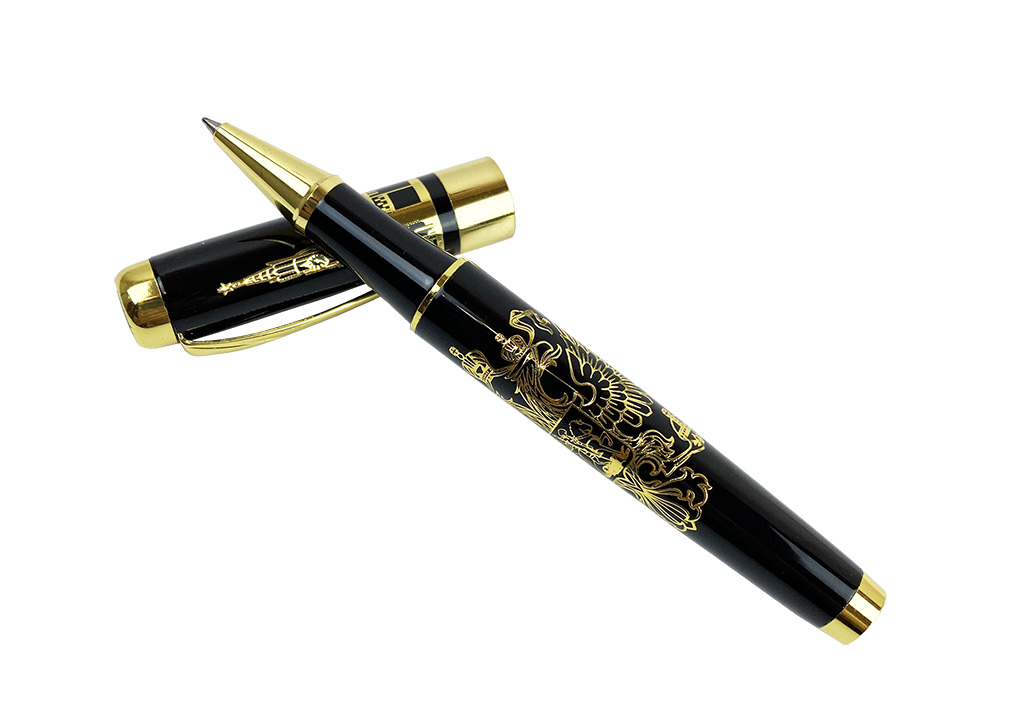Исполнение ручки:Металлический корпус черного цвета, с многослойным лаковым покрытием. Покрытие подвергнуто специальной обработке, для металлического мерцания лака. На корпус ручки наноситься объемная позолоченная символика и художественный рисунок методом гальванизации, с последующим золочением. Съёмный колпачок с отделкой и клипом под золото. Быстросохнущие чернила синего цвета, игольчатый стержень, обеспечивает тонкое и безотрывное письмо.