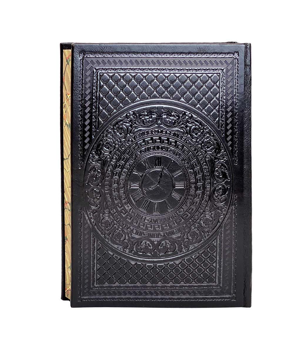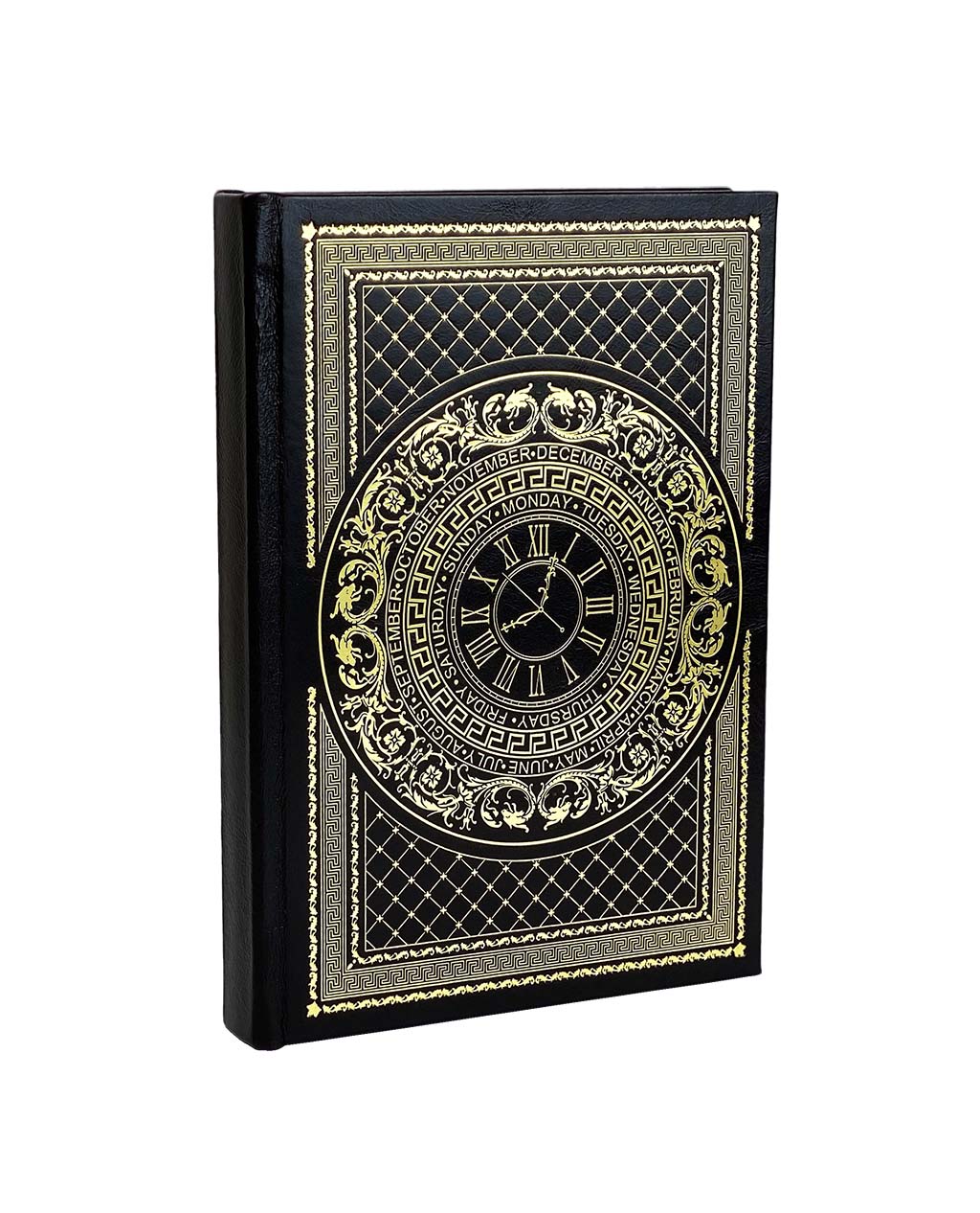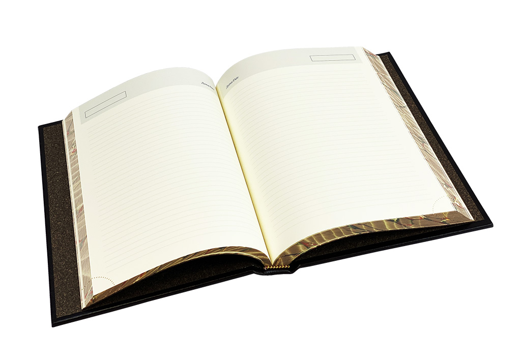 Исполнение ежедневника:Оригинальная обложка выполнена из высококачественной натуральной кожи. Сочетание блинтового и золотого тиснения. Блок изготовлен из высококачественной тонированной бумаги, с перфорацией уголка. Дизайн дополнен окрашенным в тон переплетного материала обрезом, а для удобства пользования предусмотрено шелковое ляссе.