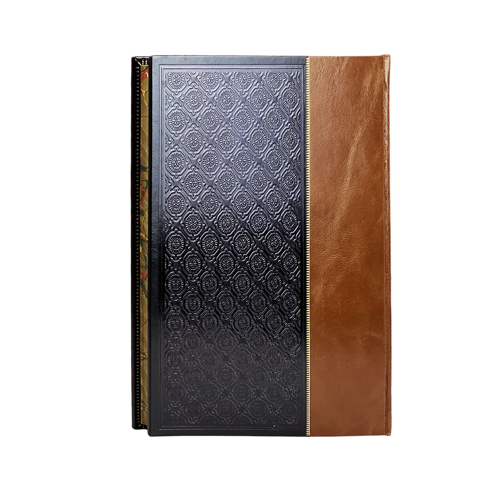 Исполнение книги:В оформлении переплета применяется сочетание двух кусков кожи разного оттенка и фактуры. Блинтовое и золотое тиснение, богато оформленные дублюрами составные форзацы. Окрашенный в тон переплетного материала обрез, ляссе.
