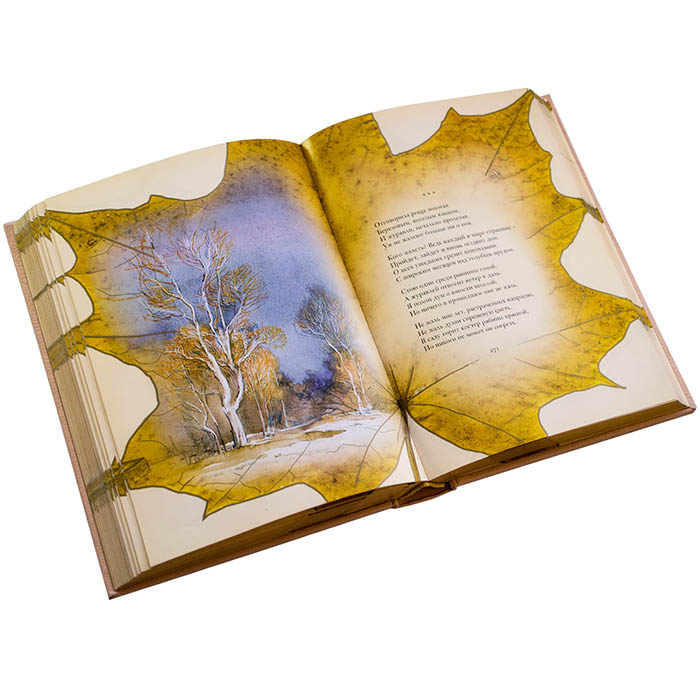 Особенности оформления: трехсторонний золотой обрез, тиснение фольгой (до 9 различных цветов) на обложке и футляре, печать в 5 цветов (4 + золото) на каждой полосе.