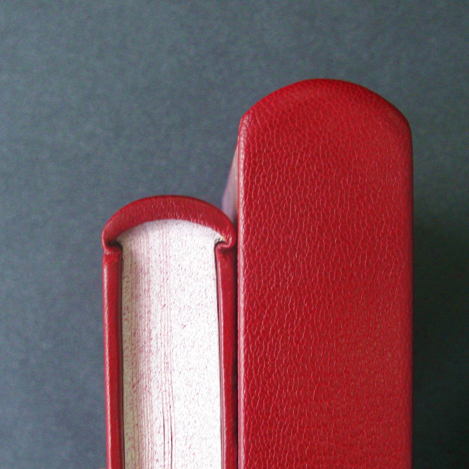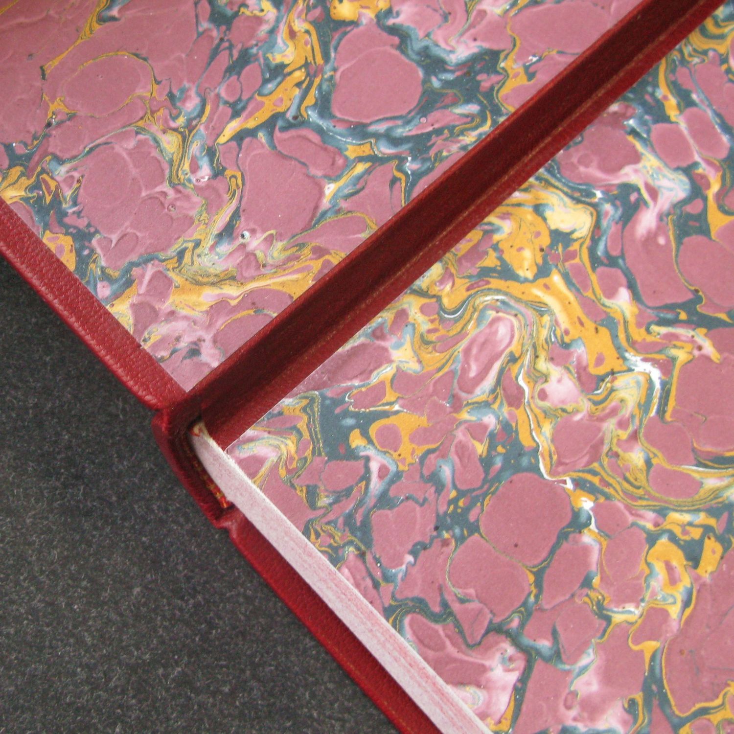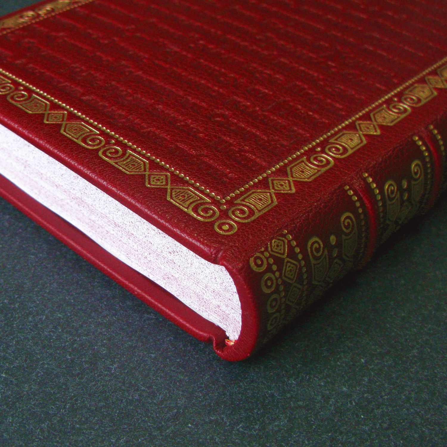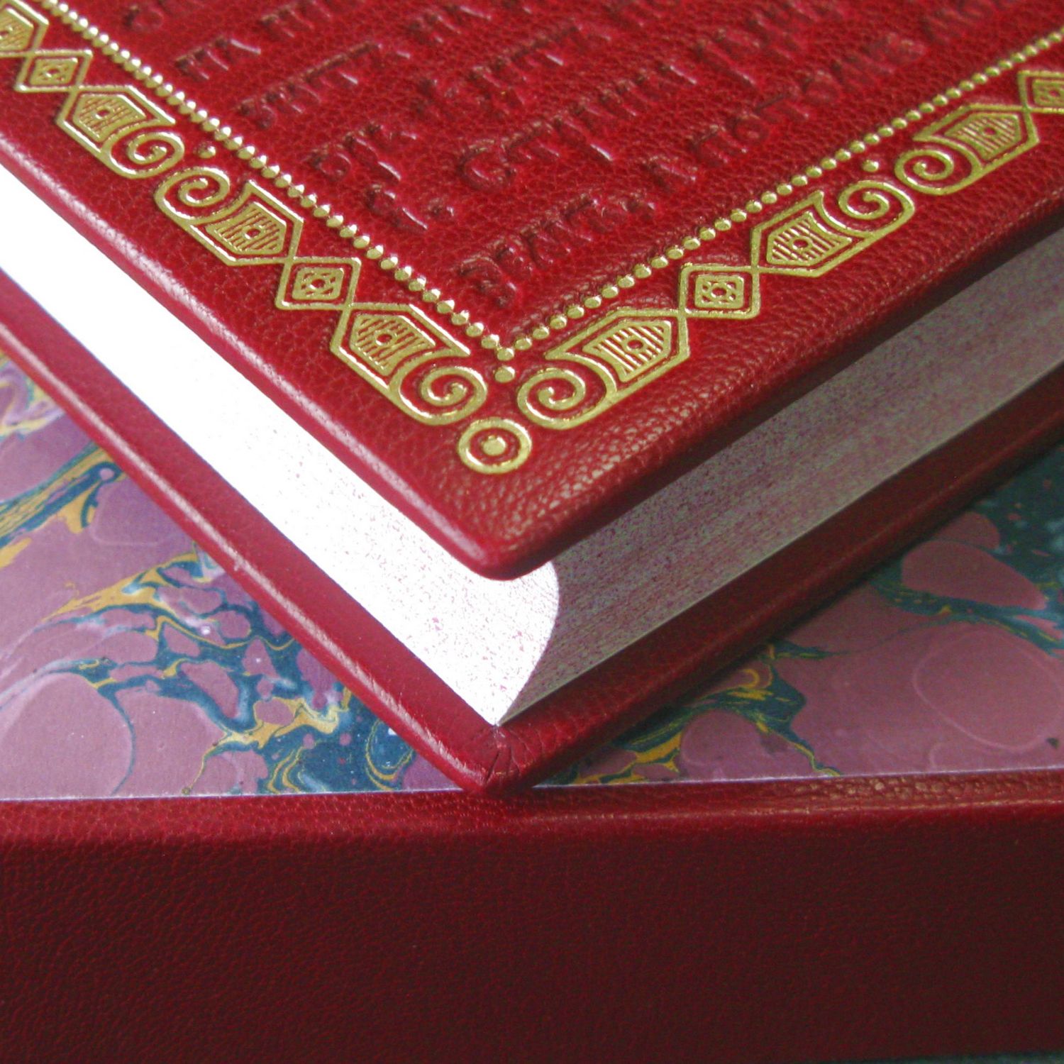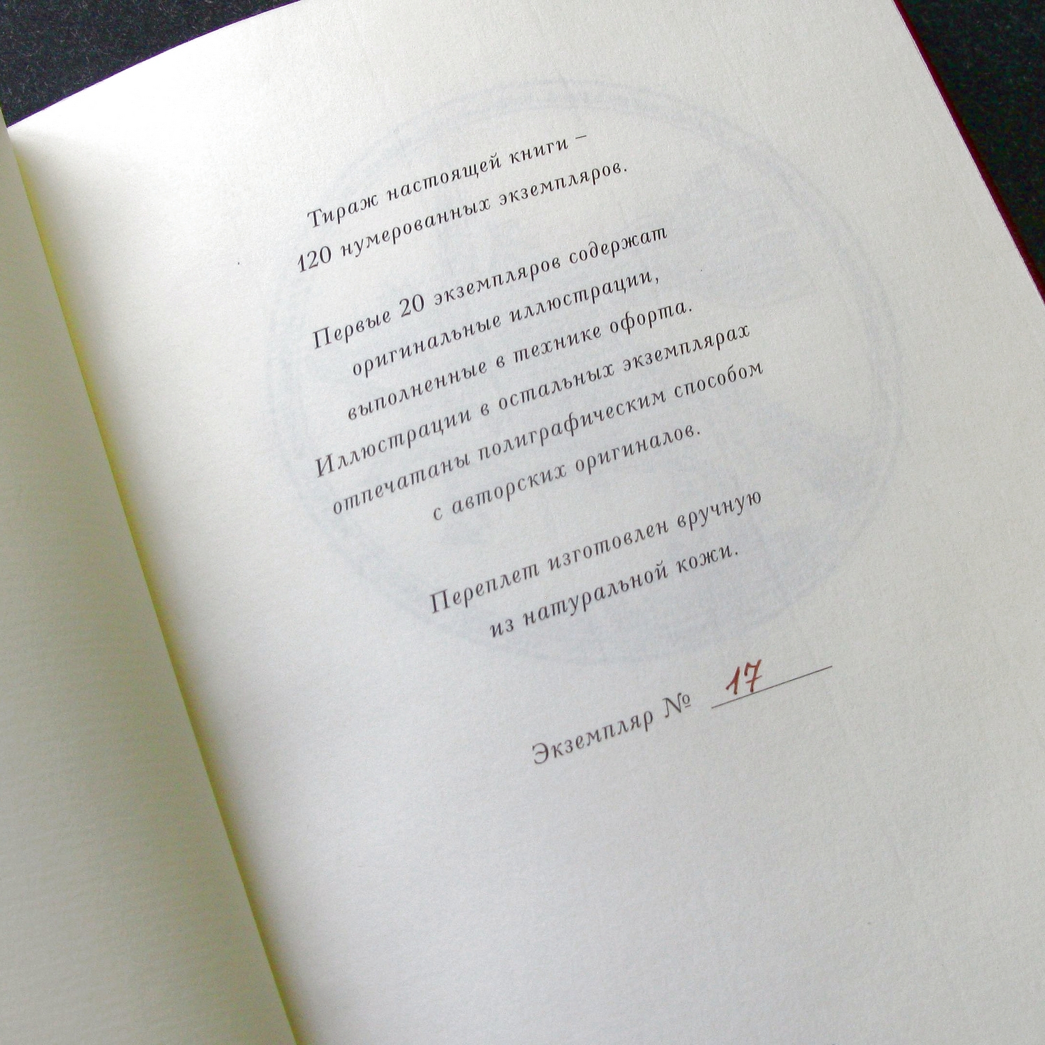 Особенности оформления:шелковые каптал и ляссе, форзацы из мраморной бумаги, наклейка из контрастной кожи на переплетной крышке, переплет украшен тиснением золотой фольгой, а также блинтовым тиснением.