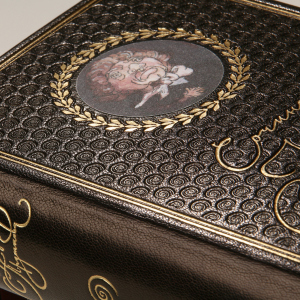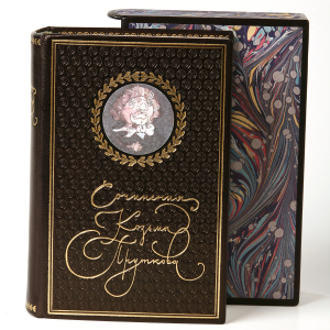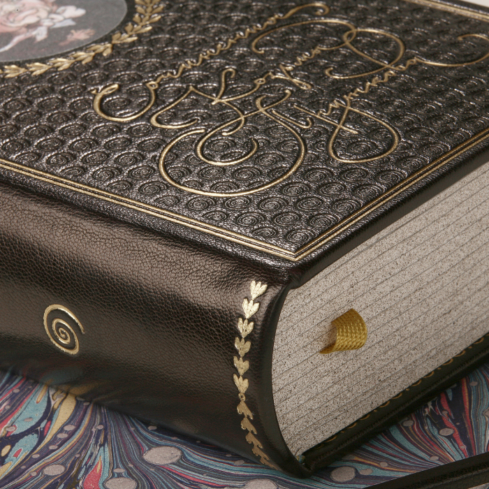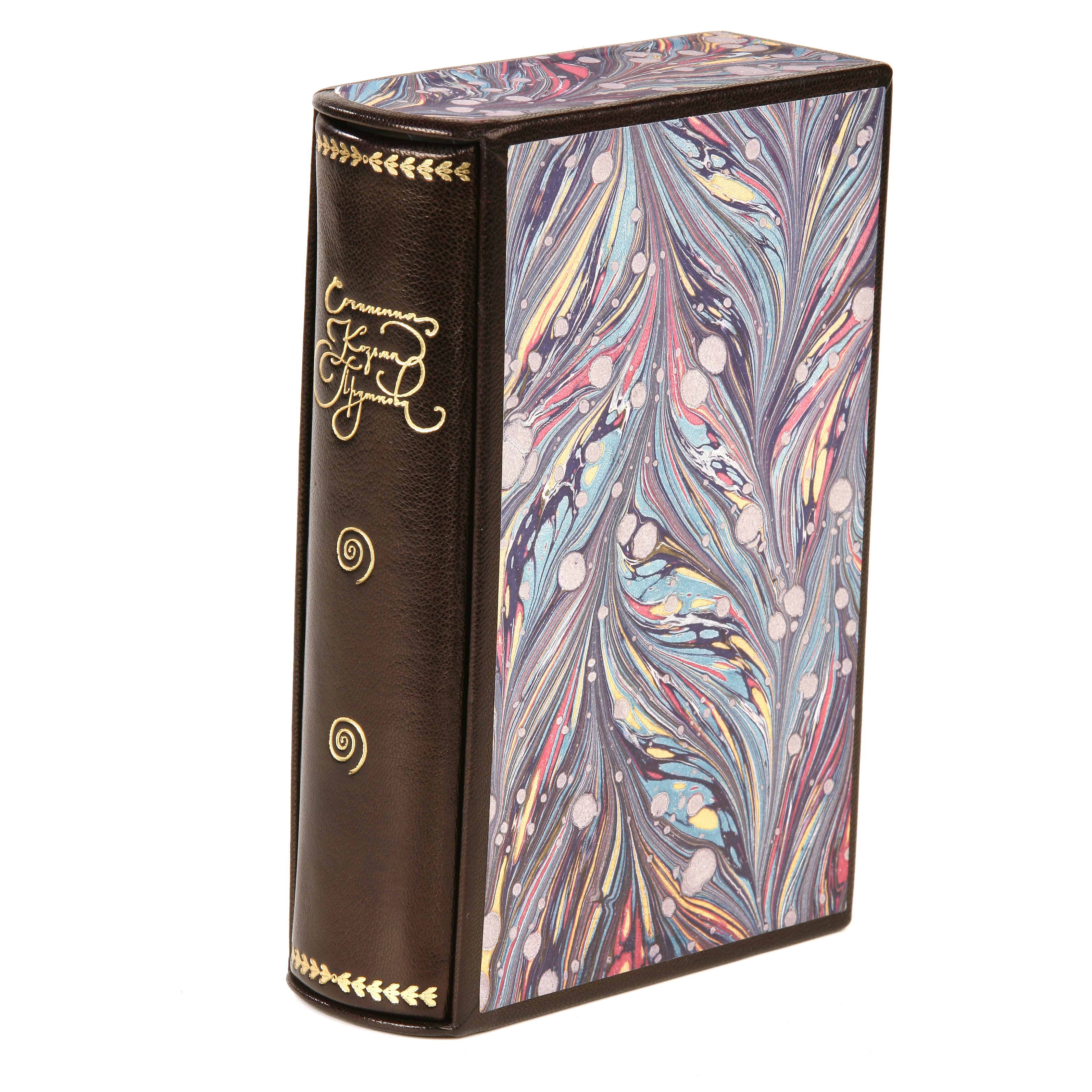 Особенности оформления:шлковые каптал и ляссе, форзацы из мраморной бумаги, переплет украшен тиснением золотой фольгой, а также блинтовым тиснением.