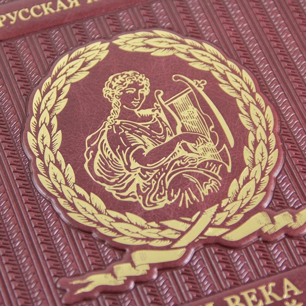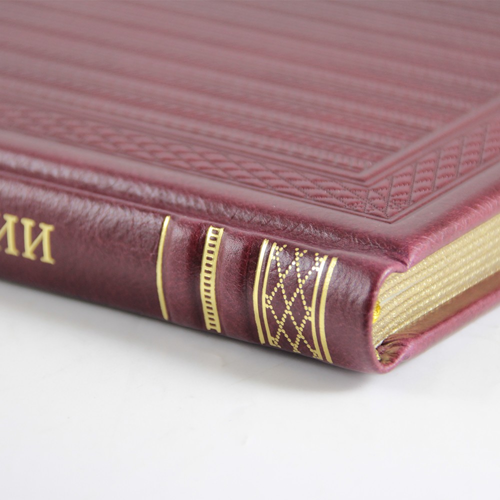 Исполнение:Переплёт ручной работы из натуральной кожи. Форзац из дизайнерской бумаги. 4 бинта на корешке, ручной обработки. Каптал золотой из натуральной кожи. Обрез блока торшонированный золотой. Тиснение блинтовое и золотой фольгой. Ляссе.