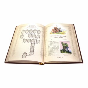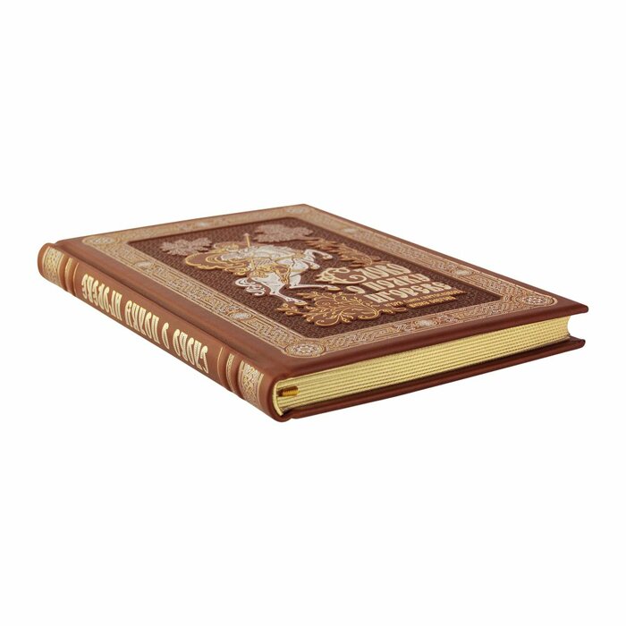 Исполнение: Переплёт ручной работы из натуральной кожи. Форзац из дизайнерской бумаги. Каптал золотой из натуральной кожи. Обрез блока торшонированный золотой. Тиснение блинтовое, золотой и серебряной фольгой. 4 бинта на корешке, ручной обработки. Ляссе.