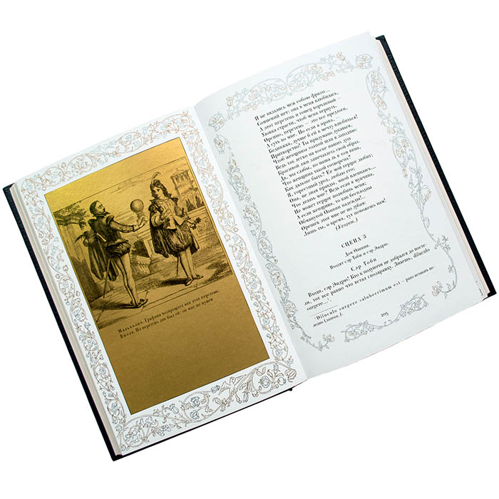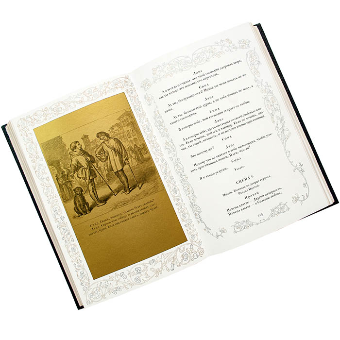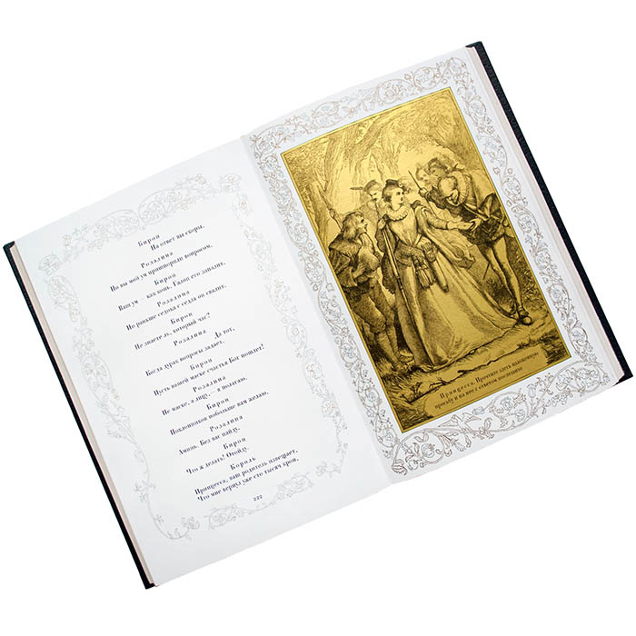 Особенности оформления: трехсторонний золотой обрез, тиснение фольгой (до 9 различных цветов) на обложке и футляре, печать в 5 цветов (4 + золото) на каждой полосе.