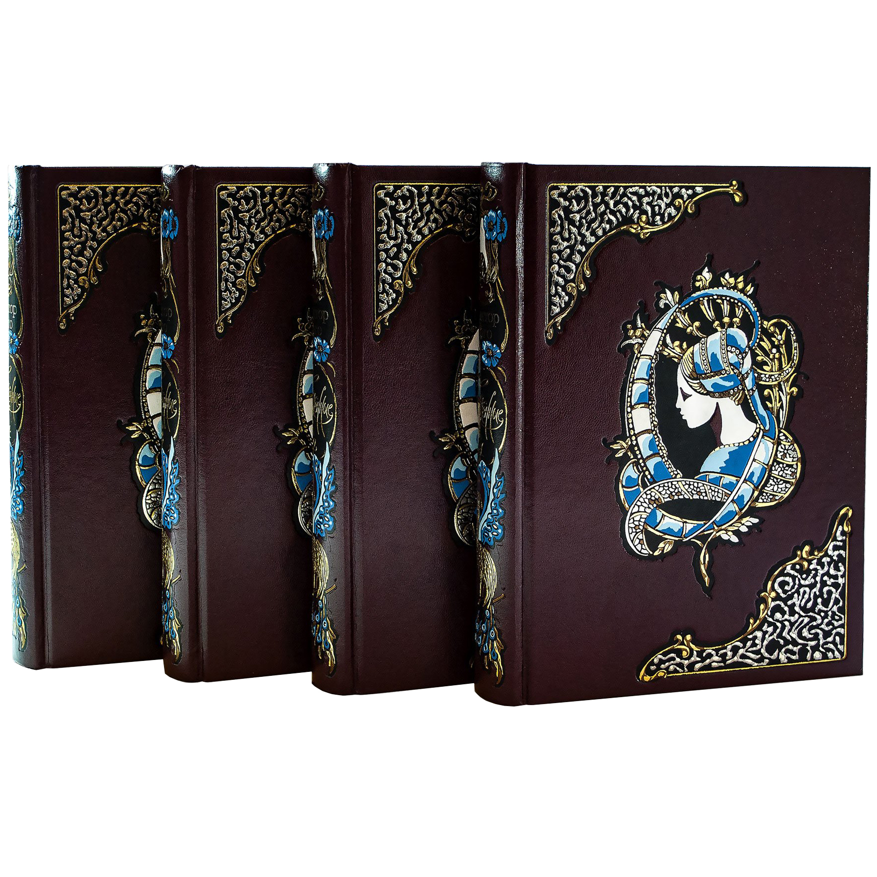 Особенности оформления: трехсторонний золотой обрез, тиснение фольгой (до 9 различных цветов) на обложке и футляре, печать в 5 цветов (4 + золото) на каждой полосе.