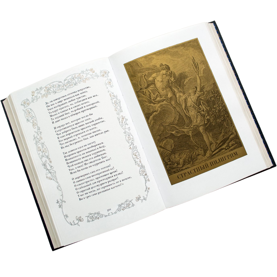 Особенности оформления: трехсторонний золотой обрез, тиснение фольгой (до 9 различных цветов) на обложке и футляре, печать в 5 цветов (4 + золото) на каждой полосе.