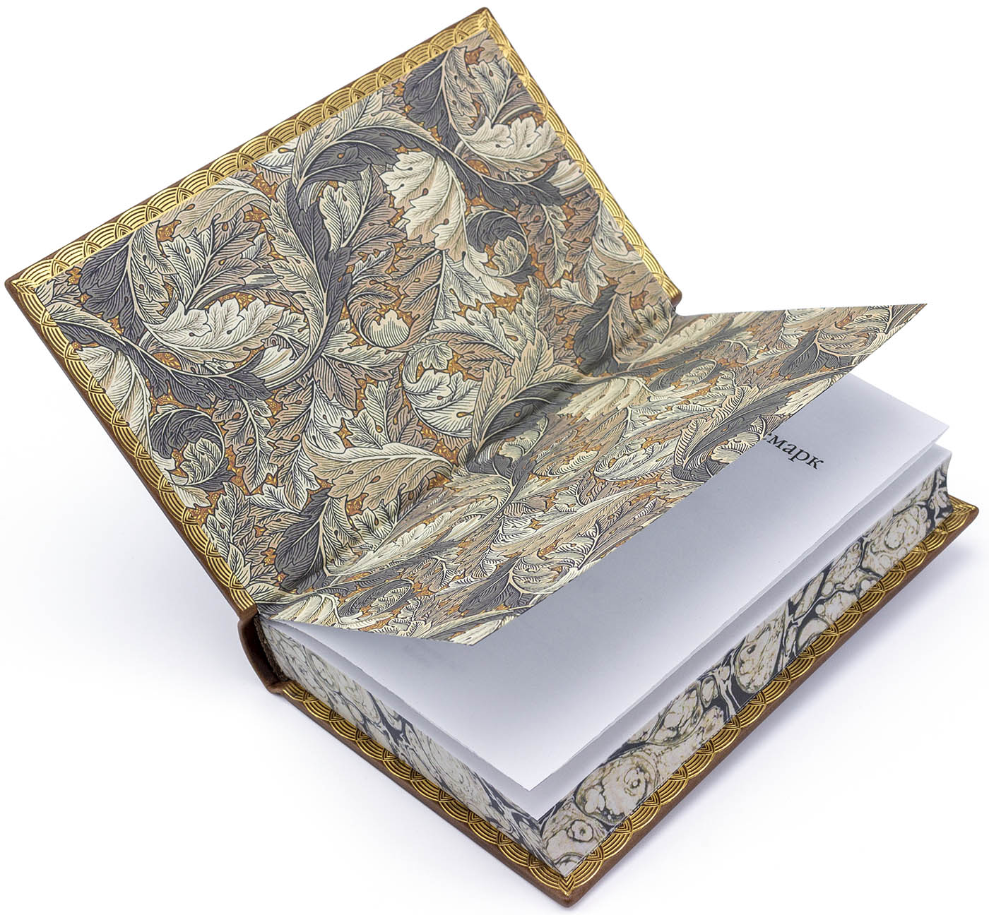 Особенности оформления:художественный стиль кожаного переплета, индивидуальный дизайн оформления. Тиснение рельефное и цветное на обложке, корешке и дублюре в тематическом оформлении. Обрезы блока страниц отшлифованы, тонированы с нанесением рисунка в стиле мраморной бумаги.