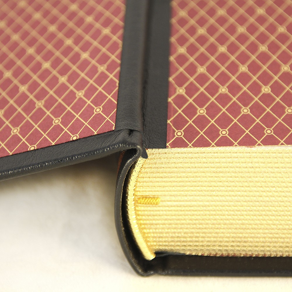Исполнение: классический европейский переплёт ручной работы из натуральной кожи, форзац из дизайнерской бумаги Malmero с тиснением орнамента золотой фольгой, 6 бинтов на корешке, ручной обработки, каптал золотой из натуральной кожи, обрез блока – золото с торшонированием, тиснение блинтовое, золотой и цветной фольгой, ляссе.