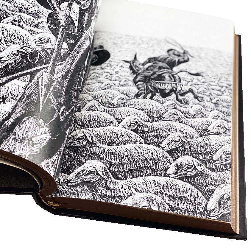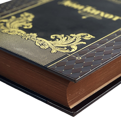 Исполнение: цельнокожаный переплёт ручной работы, украшен золотым и блинтовым тиснением, корешок книги декорирован бинтами, крашенный обрез, верхняя сторона обреза украшена золотой накаткой в ручную, ляссе из шелковой ленты, форзац цельный из дизайнерской бумаги.
