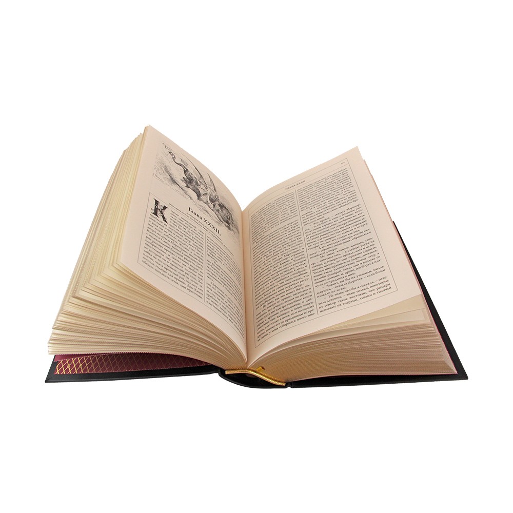 Исполнение: Классический европейский переплёт ручной работы из натуральной кожи. Форзац из дизайнерской бумаги Malmero с тиснением орнамента золотой фольгой. 6 бинтов на корешке, ручной обработки. Каптал золотой из натуральной кожи. Обрез блока – золото с торшонированием. Тиснение блинтовое, золотой и цветной фольгой. Ляссе.