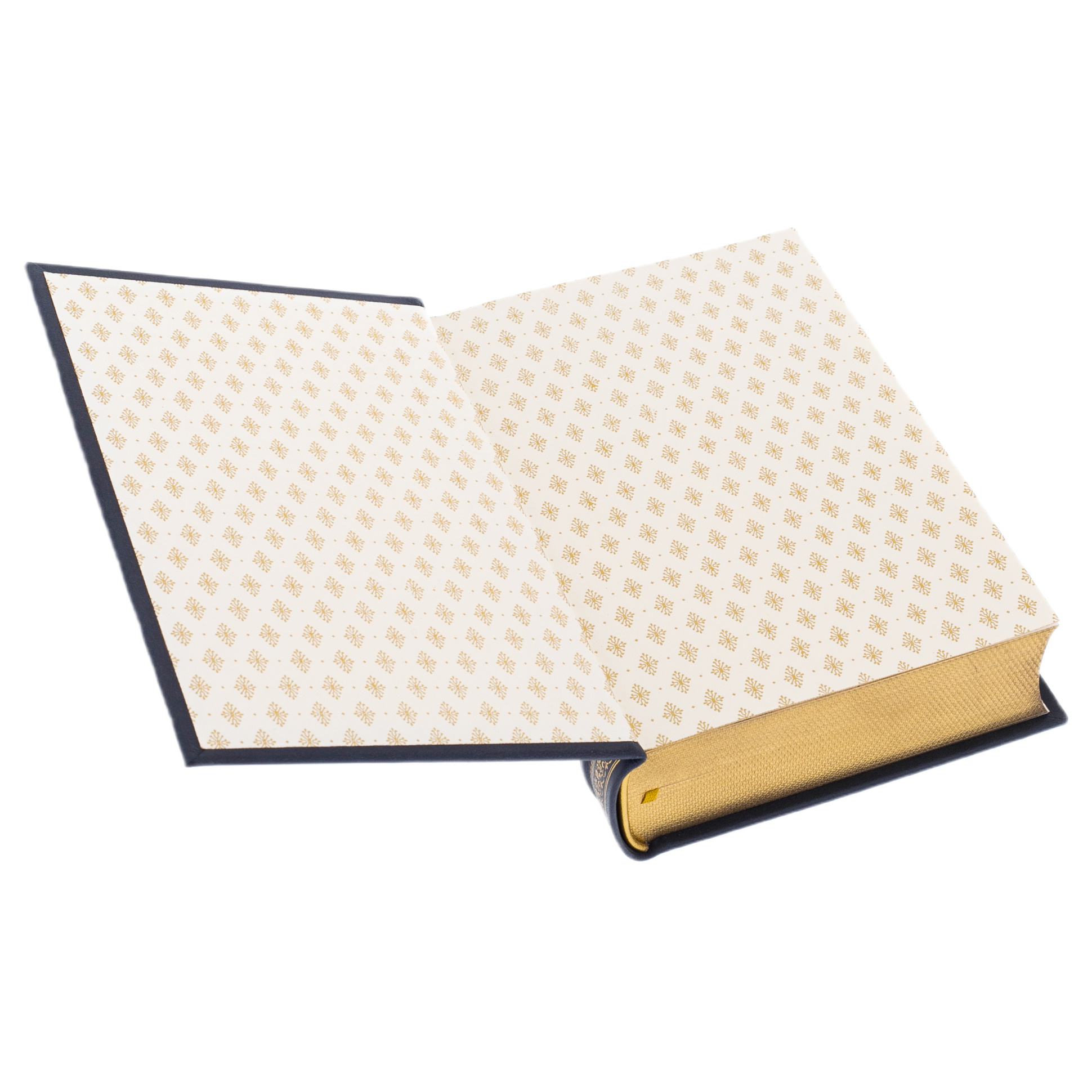 Исполнение: Переплёт ручной работы из натуральной кожи. Форзац из дизайнерской бумаги. 6 бинтов на корешке, ручной обработки. Каптал золотой из натуральной кожи. Обрез блока торшонированный золотой. Тиснение блинтовое и золотой фольгой. Ляссе.