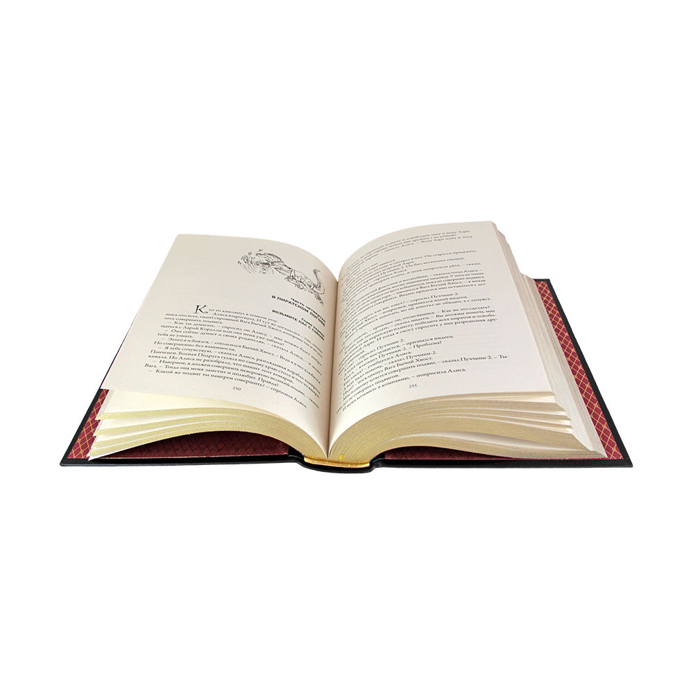 Исполнение: Классический европейский переплёт ручной работы из натуральной кожи. Форзац из дизайнерской бумаги Malmero с тиснением орнамента золотой фольгой. 6 бинтов на корешке, ручной обработки. Каптал золотой из натуральной кожи. Обрез блока — золото с торшонированием. Тиснение блинтовое, золотой и цветной фольгой. Ляссе.