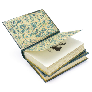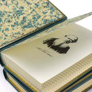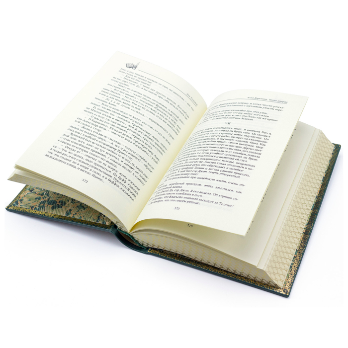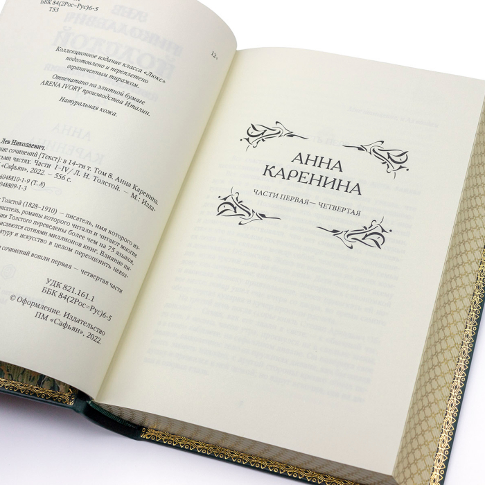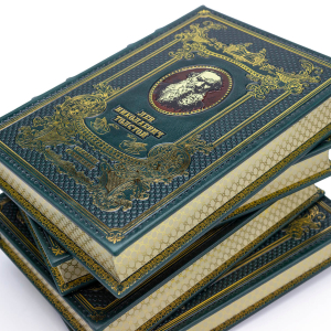 Особенности:обрезы блоков страниц вручную отшлифованы, тонированы с нанесением орнамента золотой фольгой.