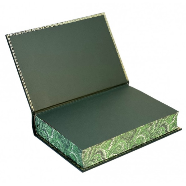 Цельнокожаный переплёт ручной работы, украшен золотым тиснением и художественной кожаной вставкой. Корешок декорирован бинтами. Обрез оформлен в технике "Перо павлина". Ляссе из шёлковой ленты. Форзац цельный из дизайнерской бумаги. Книга представлена в оригинальной подарочной упаковке.