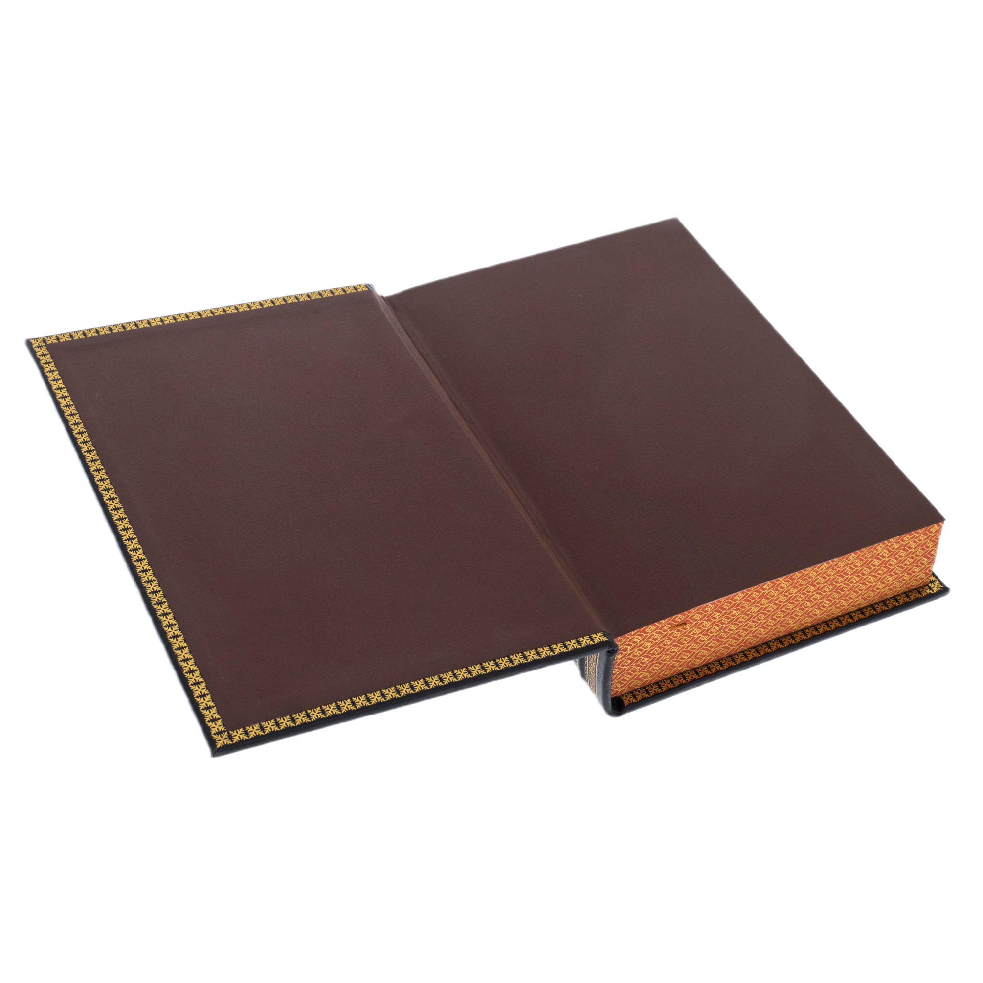 Оформление: цельнокожаный переплет ручной работы, украшен цветной кожаной вставкой, золотым и блинтовым тиснением. Корешок декорирован золочеными блинтами. Обрез оформлен художественным изображением. Ляссе из шелковой ленты. Форзац цельный из дизайнерской бумаги. Дублюра откатана золотом. Цветовое сочетание переплета и упаковки может отличаться от представленных на фото.