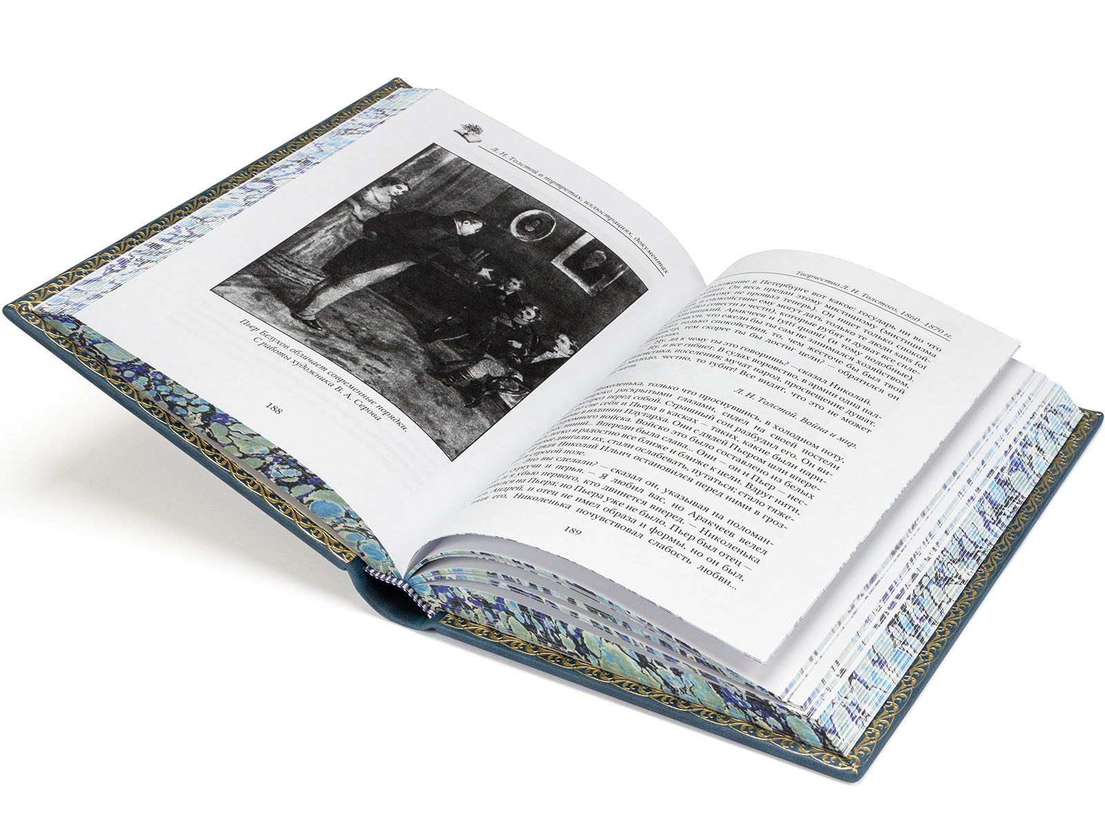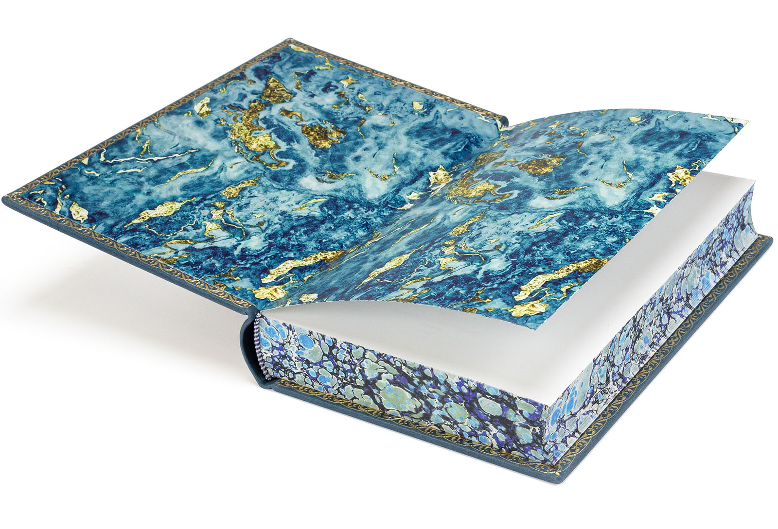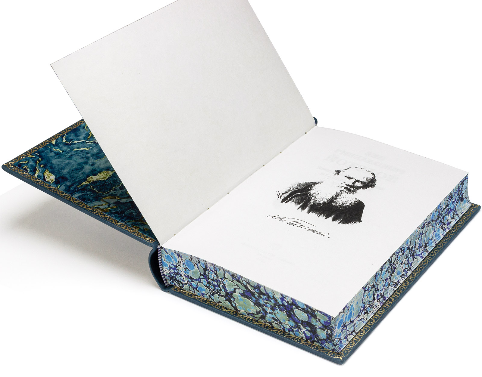 Особенности оформления:ручной кожаный переплет, высокого качества переплетная кожа редкого василькового цвета с уникальным рельефным и цветным тиснением, обрезы страниц украшены в стиле рисунка мрамора, индивидуальный дизайн тиснения. Блоки страниц отшлифованы и тонированы золочением.