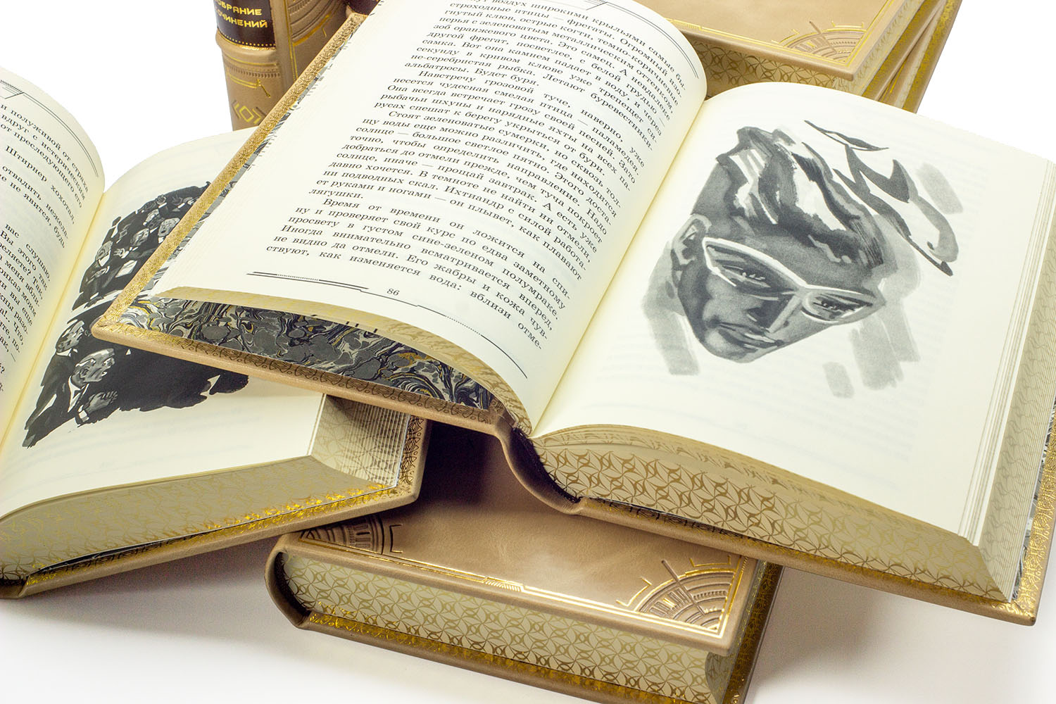 Особенности оформления:кожаный французский переплет ручной работы, золотое, блинтовое тиснения, на корешке - бинты, трехсторонний обрез книги ошкурен и тонирован вручную с прокаткой узора золотом.