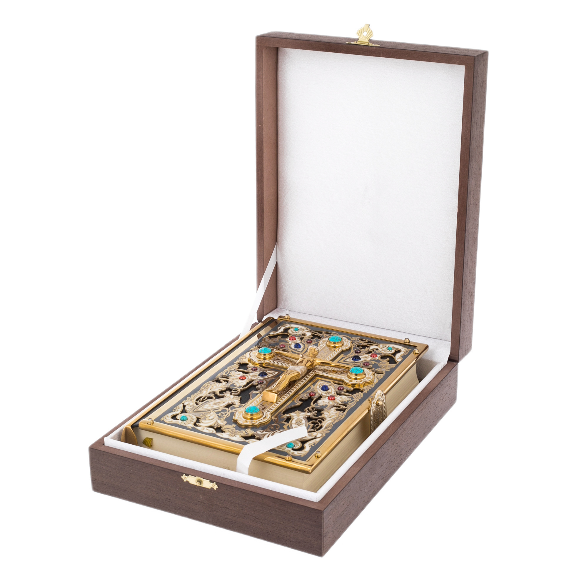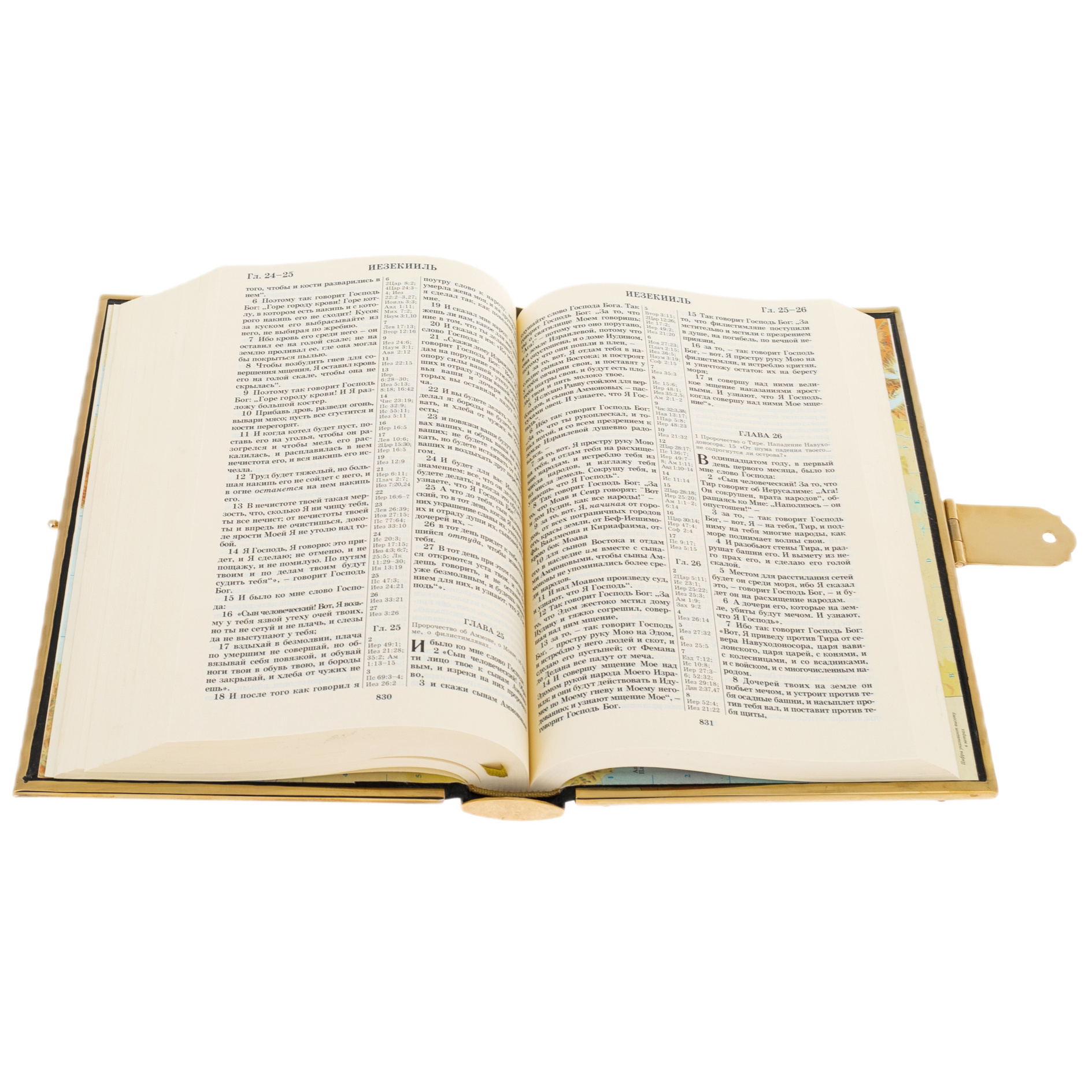 Обложка Библии выполнена из благородных материалов, покрытых тончайшими золотыми узорами, отражающими богатую традицию златоустовского искусства. Каждый элемент этой книги излучает величие и благородство, вознося душу к вечным истинам и духовным размышлениям. В центре обложки возвышается крест, инкрустированный фианитами, чье сияние символизирует свет веры и надежды, проливающийся на каждого, кто прикоснется к этому святому писанию.
