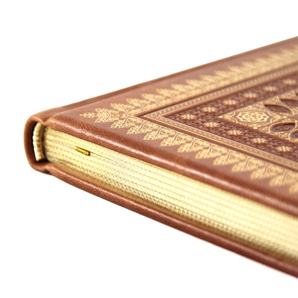 Исполнение: Переплёт ручной работы из натуральной кожи. Форзац из дизайнерской бумаги. 4 бинта на корешке, ручной обработки. Каптал золотой из натуральной кожи. Обрез блока торшонированный золотой. Тиснение блинтовое и золотой фольгой. Ляссе.