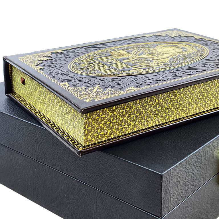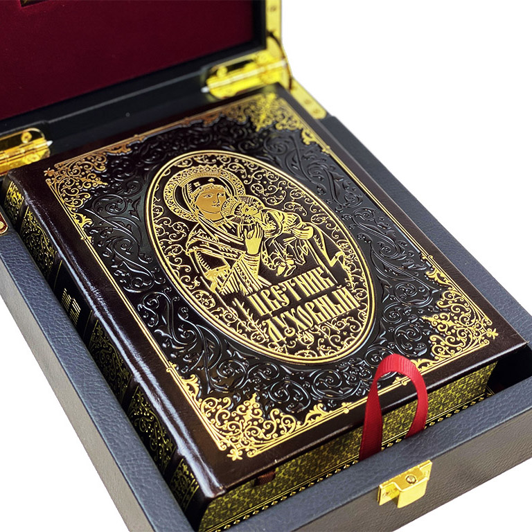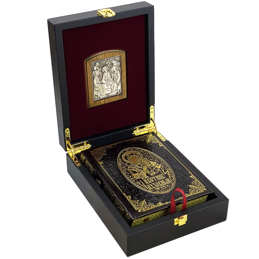 Исполнение: Дизайн издания представлен сочетанием блинтового и золотого тиснения, темно зеленые кожаные вставки и дополнен оригинально рисованным обрезом. Богато оформленные дублюрами составные форзацы из дизайнерской бумаги, шелковое ляссе. Икона выполнена методом гальванопластики с серебрением поверхности, в сочетании с деревянной основой.