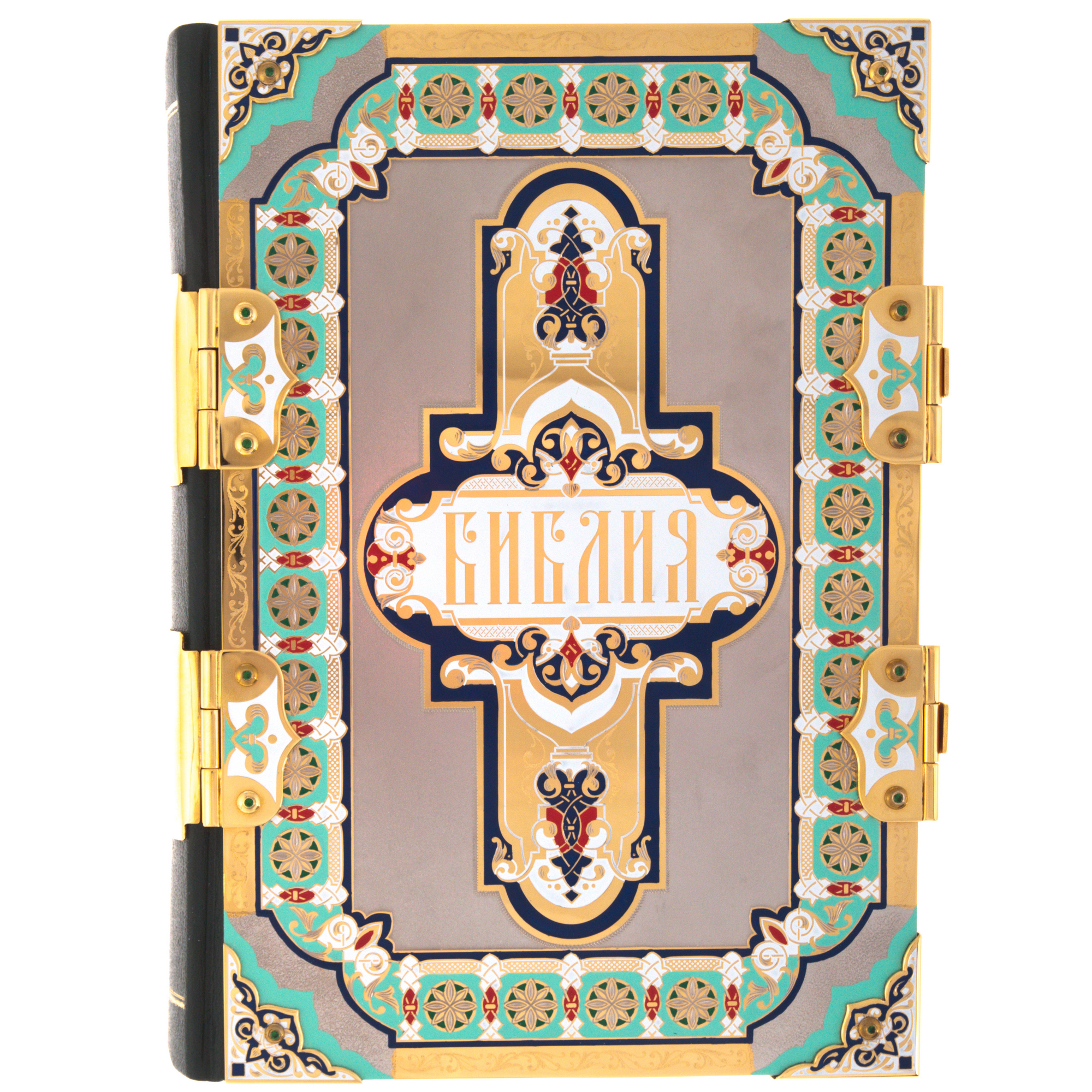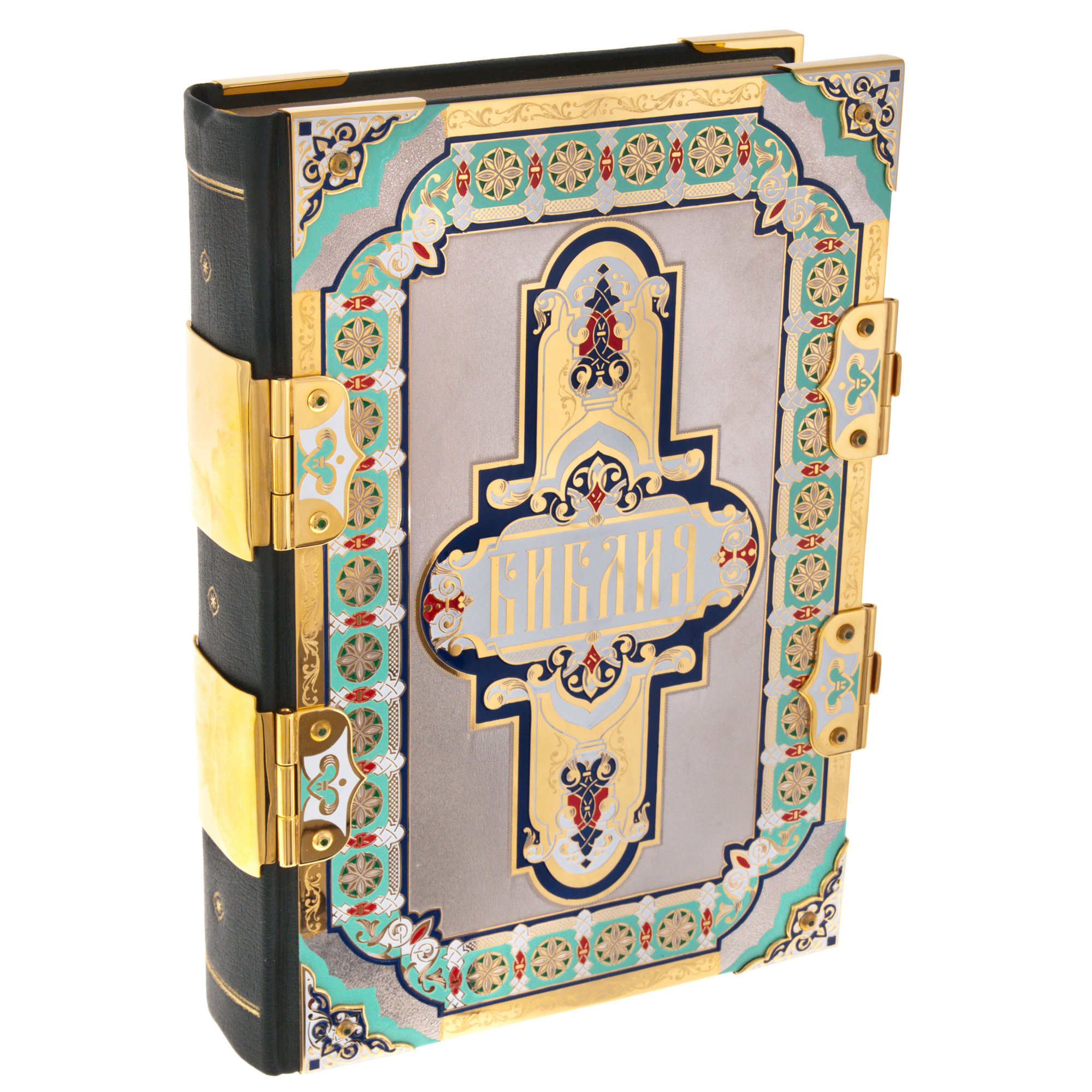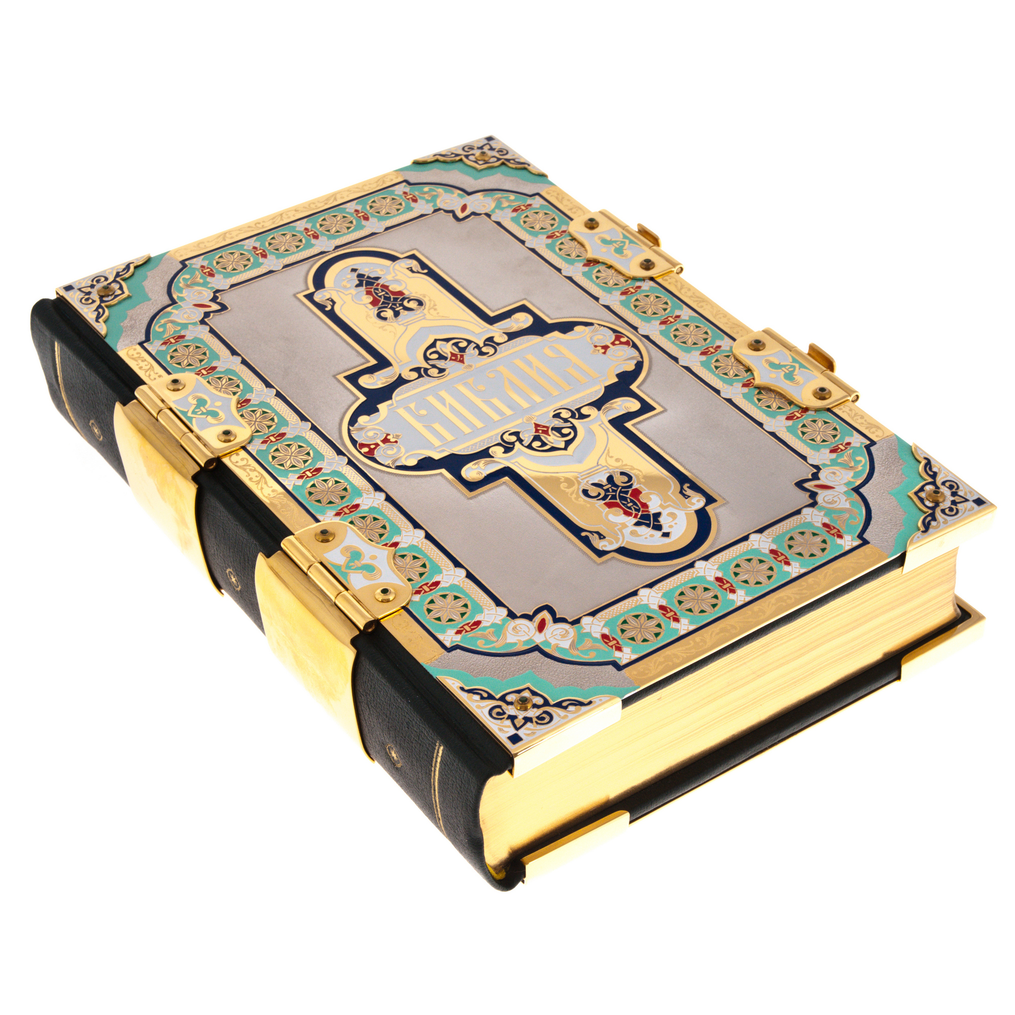 Библия в декорированном золотом и драгоценными камнями окладе, с рисунком цветными эмалями и гравировкой от златоустовских мастеров - символичный и уместный сувенир на церковные праздники, а также венчание, крещение, день свадьбы. Иллюстрированное издание Нового и Ветхого заветов в кожаном переплёте станет одной из главных семейных ценностей. Созданная по всем православным канонам, эта Библия - эксклюзивный экземпляр, с уникальным орнаментом, созданным полностью вручную.