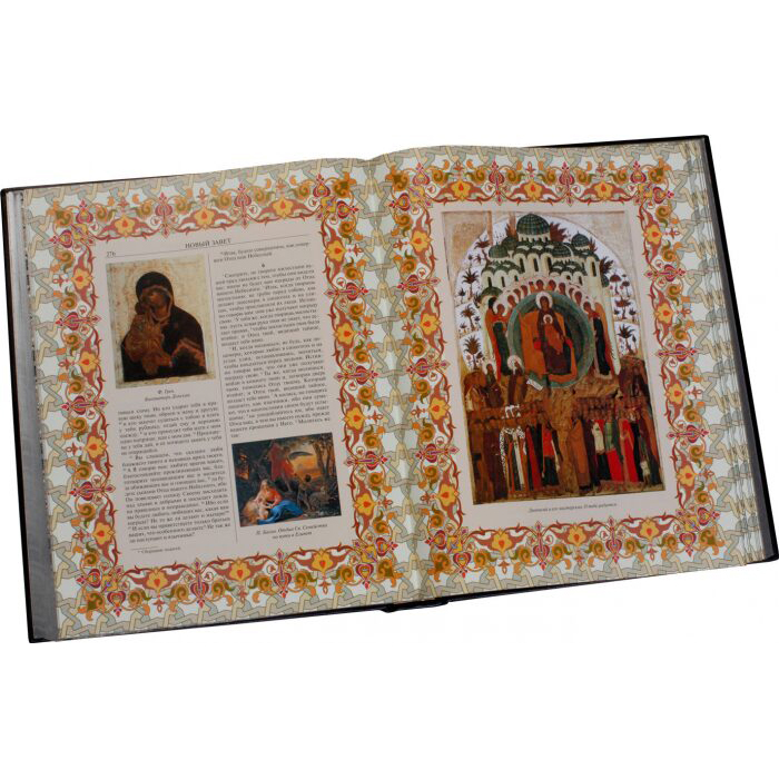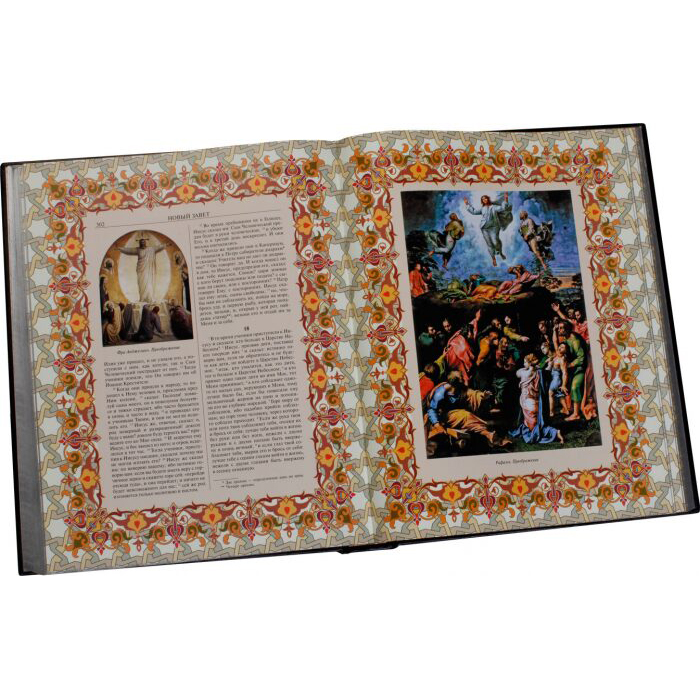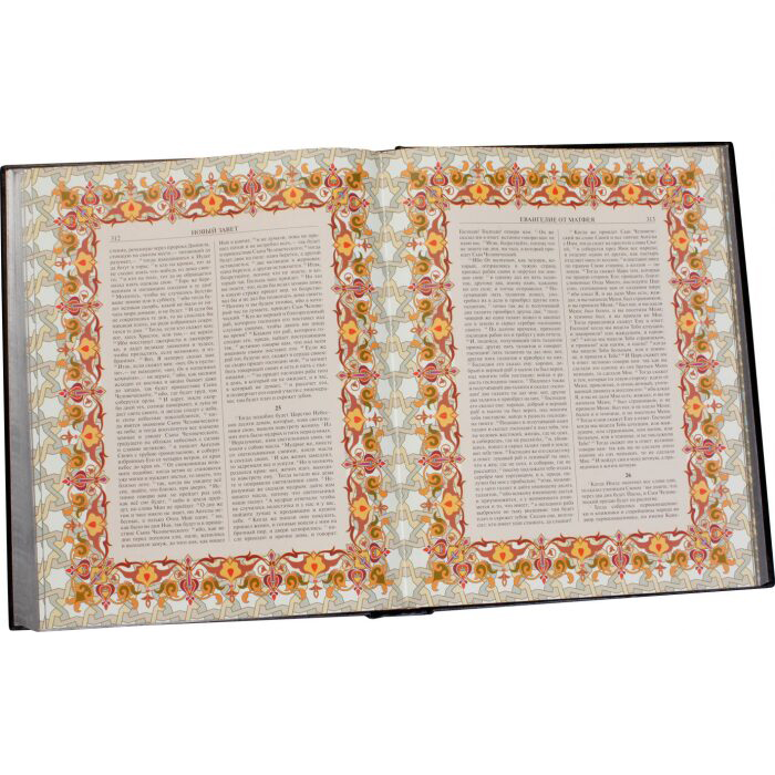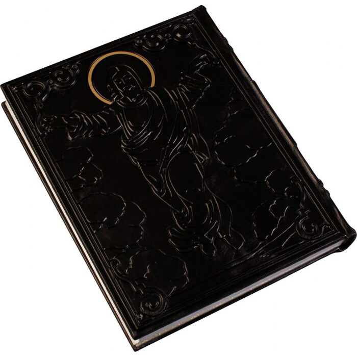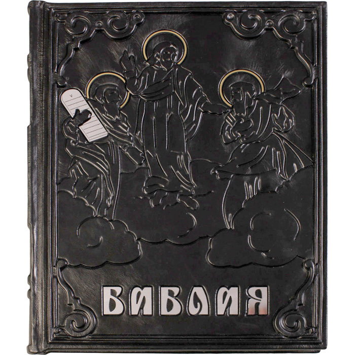Исполнение:переплет французский цельно кожаный, ручной работы. Кожа, цвет - "черное дерево"(Италия). Рельеф на коже и тиснение выполнены вручную. В центре - художественная композиция, обрамление – гравировка, цвет -"золото" и "серебро" Каптал шелковый, ручного плетения. Форзац составной. Обрез полированный, цвет - "серебро".