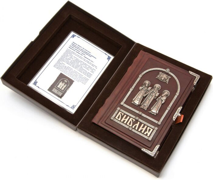 Особенности оформления:переплет книги изготовлен из натуральной телячьей кожи и вручную украшен серебряным окладом высокой степени проработки. Библия напечатана на рисовой бумаге в Южной Корее. Снабжена закладкой и украшена трехсторонним золотым обрезом. На замке книги стоят клейма мастерской и пробирной палаты.