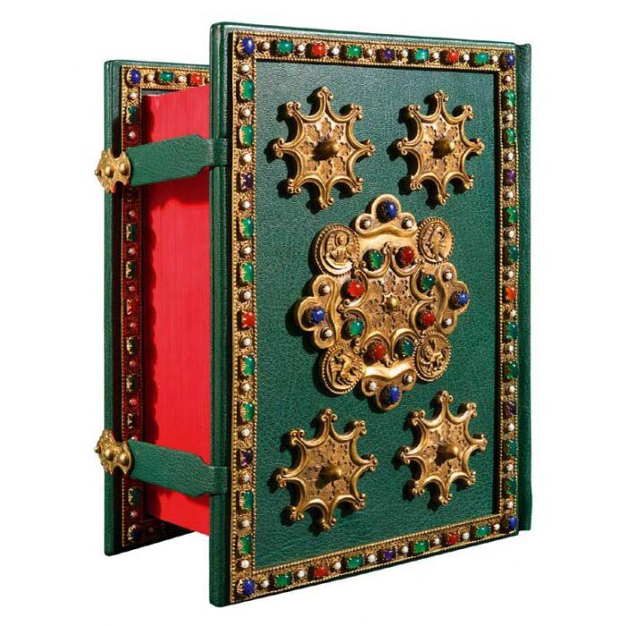 Библия – вечная мудрость, запечатленная в слове, символ веры, власти и духовного наследия. Перед вами редчайшее издание, облаченное в драгоценный оклад, достойный королевских библиотек. Металл, превращенный в художественное полотно, сияет утонченными орнаментами, излучая благородство золотого тиснения. Глубокий зеленый цвет переплета подчеркивает священный статус книги, а россыпь полудрагоценных камней – лазурита, оникса, сердолика и жемчуга – придает ей величие артефакта, перешедшего сквозь века. Это не просто издание, а наследие, в котором сакральные смыслы встречаются с искусством высочайшего уровня.
