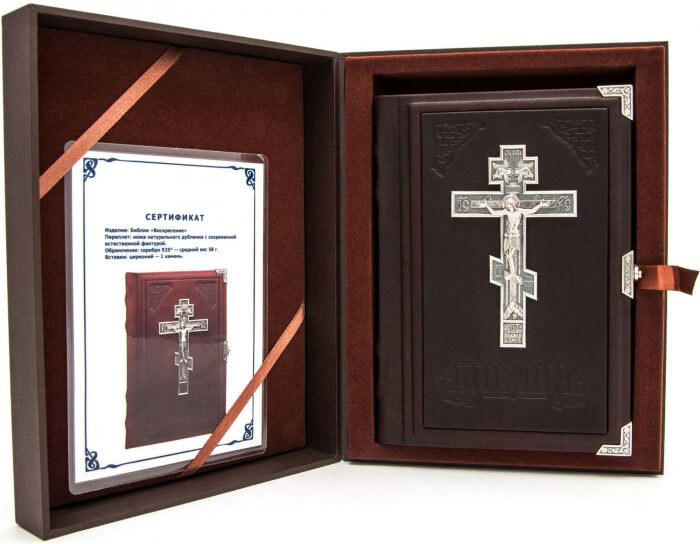 Особенности оформления:переплет книги из кожи натурального дубления с сохраненной естественной фактурой. Библия напечатана на рисовой бумаге в Южной Корее. Снабжена закладкой и украшена трехсторонним золотым обрезом. На замке книги стоят клейма мастерской и пробирной палаты.
