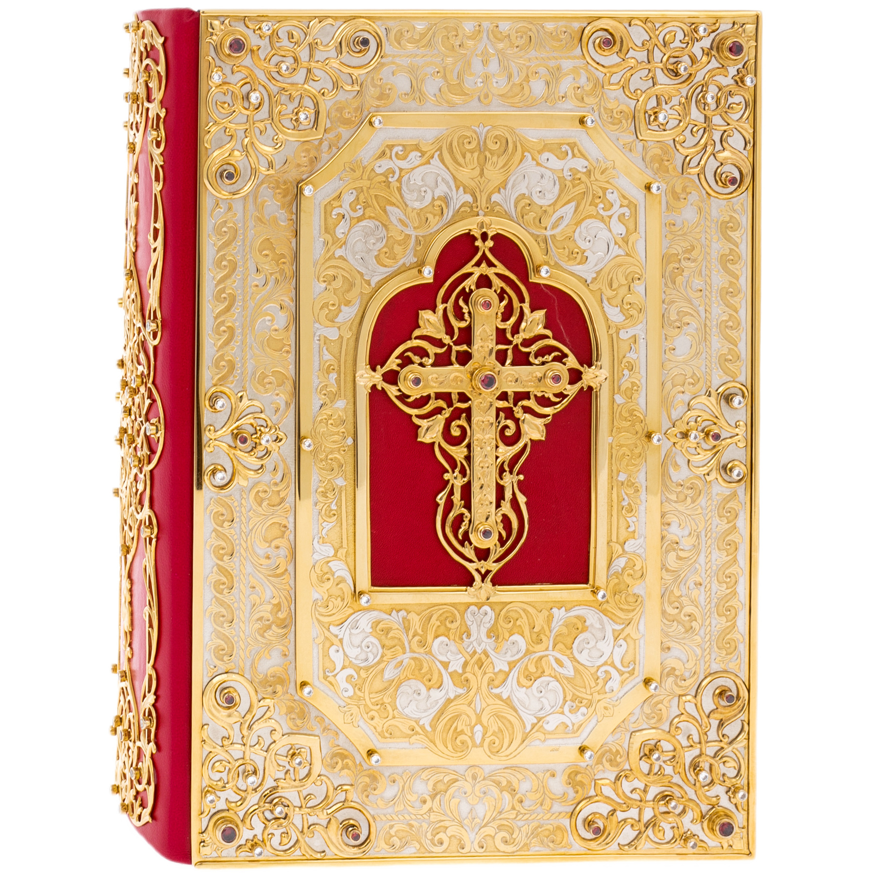 Эта украшенная книга в оформлении златоустовских мастеров являет собой предмет, созданный как для чтения, так и для созерцательного обладания. Основание из плотного переплёта, обтянутого глубоким насыщенно-алым материалом, заключено в монументальные золотые накладки, формирующие впечатление церковного оклада, исполненного в лучших традициях русского художественного металла. Центральная часть украшена арочным обрамлением с рельефным крестом, выполненным из золочёного металла и дополненным филигранным рисунком, создающим ощущение драгоценного реликвария.