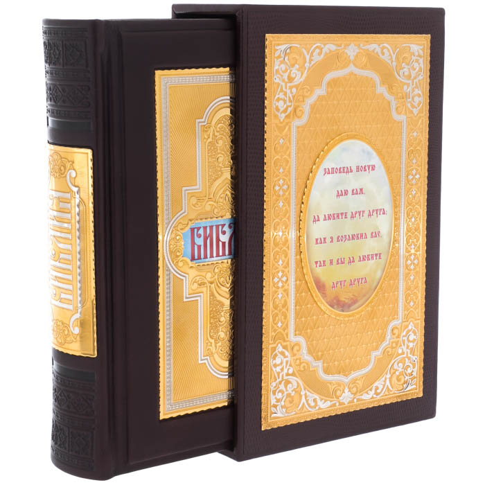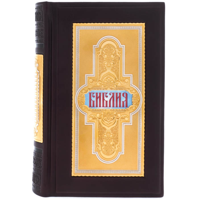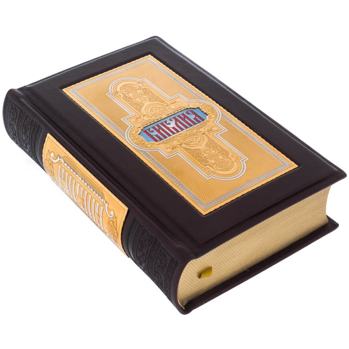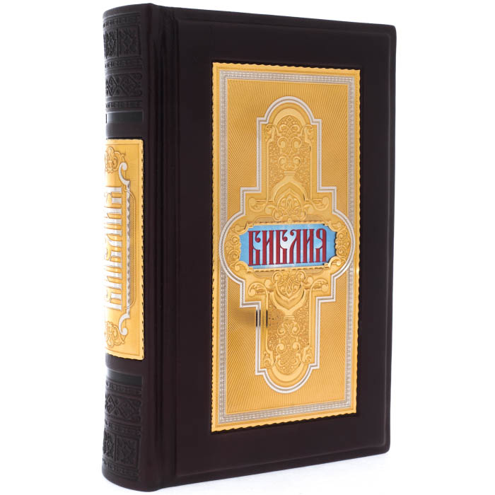 Особенности оформления Библии: офсетная бумага, цельнокожаный переплет ручной работы, латунные вставки в стиле Златоустовской гравюры, тиснение, полированный и окрашенный обрез, ляссе.
