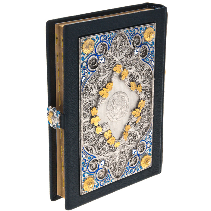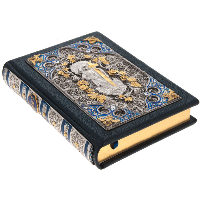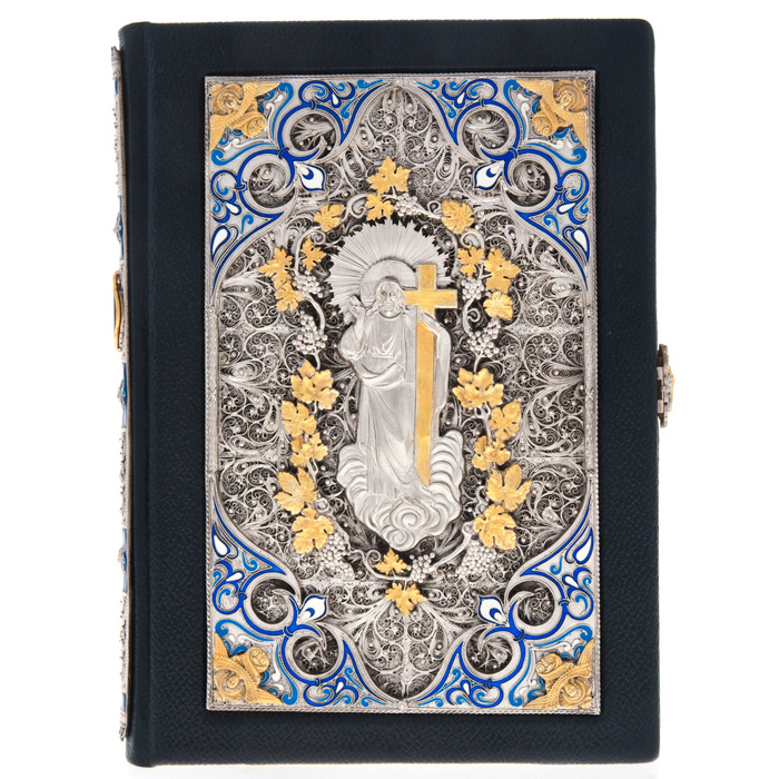 Особенности оформления: мелованная бумага; цельнокожаный переплет ручной работы, накладки выполненные методом гальванопластики с покрытием серебром и золотом, тиснение с использованием золотой фольги, корешок украшен накладкой с использованием эмалей, дизайнерская бумага, вручную полированный и окрашенный обрез, ляссе.