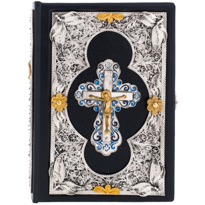 Особенности оформления: мелованная бумага; цельнокожаный переплет ручной работы, накладки выполненные методом гальванопластики с покрытием серебром и золотом, тиснение с использованием золотой фольги, корешок украшен накладкой с использованием эмалей, дизайнерская бумага, вручную полированный и окрашенный обрез, ляссе.