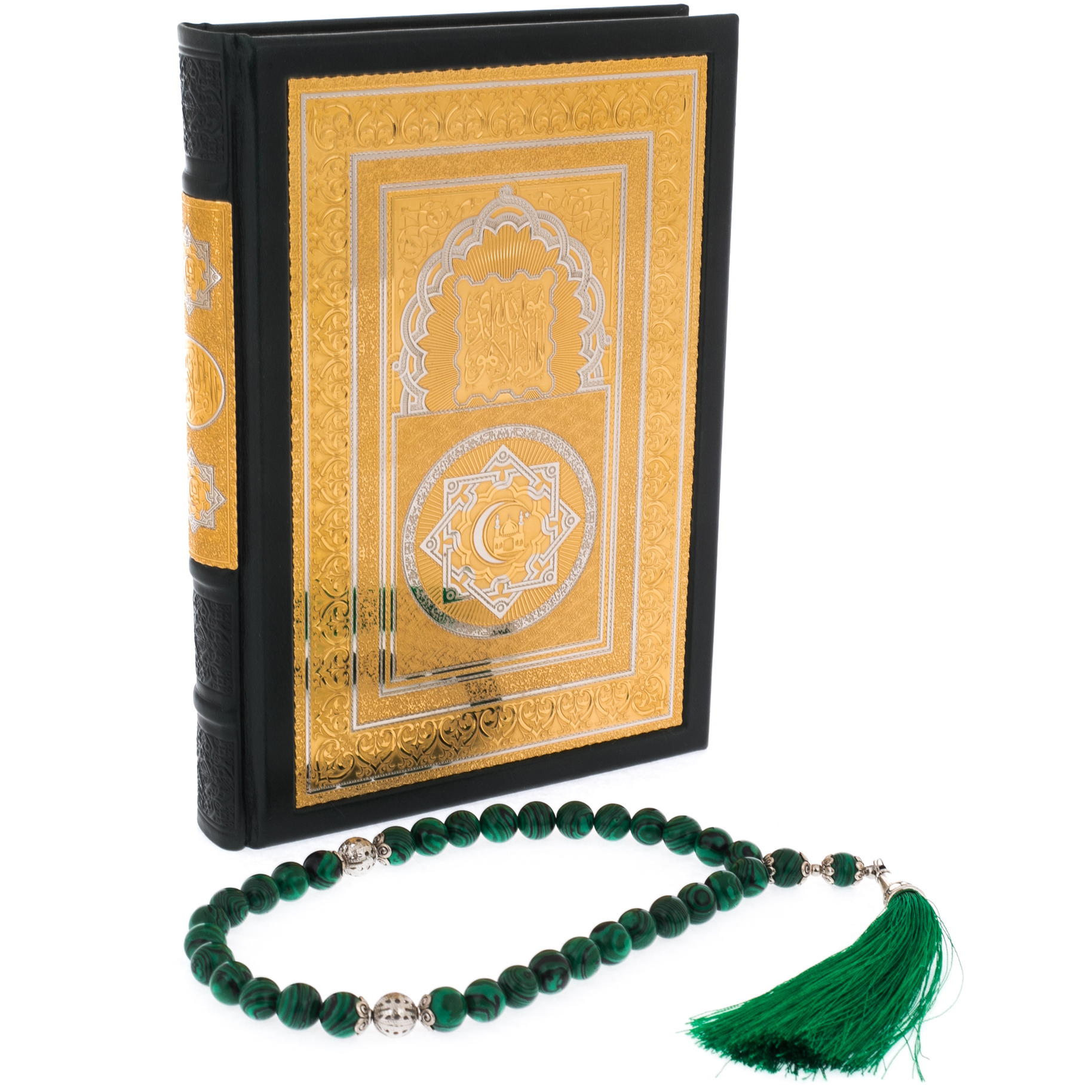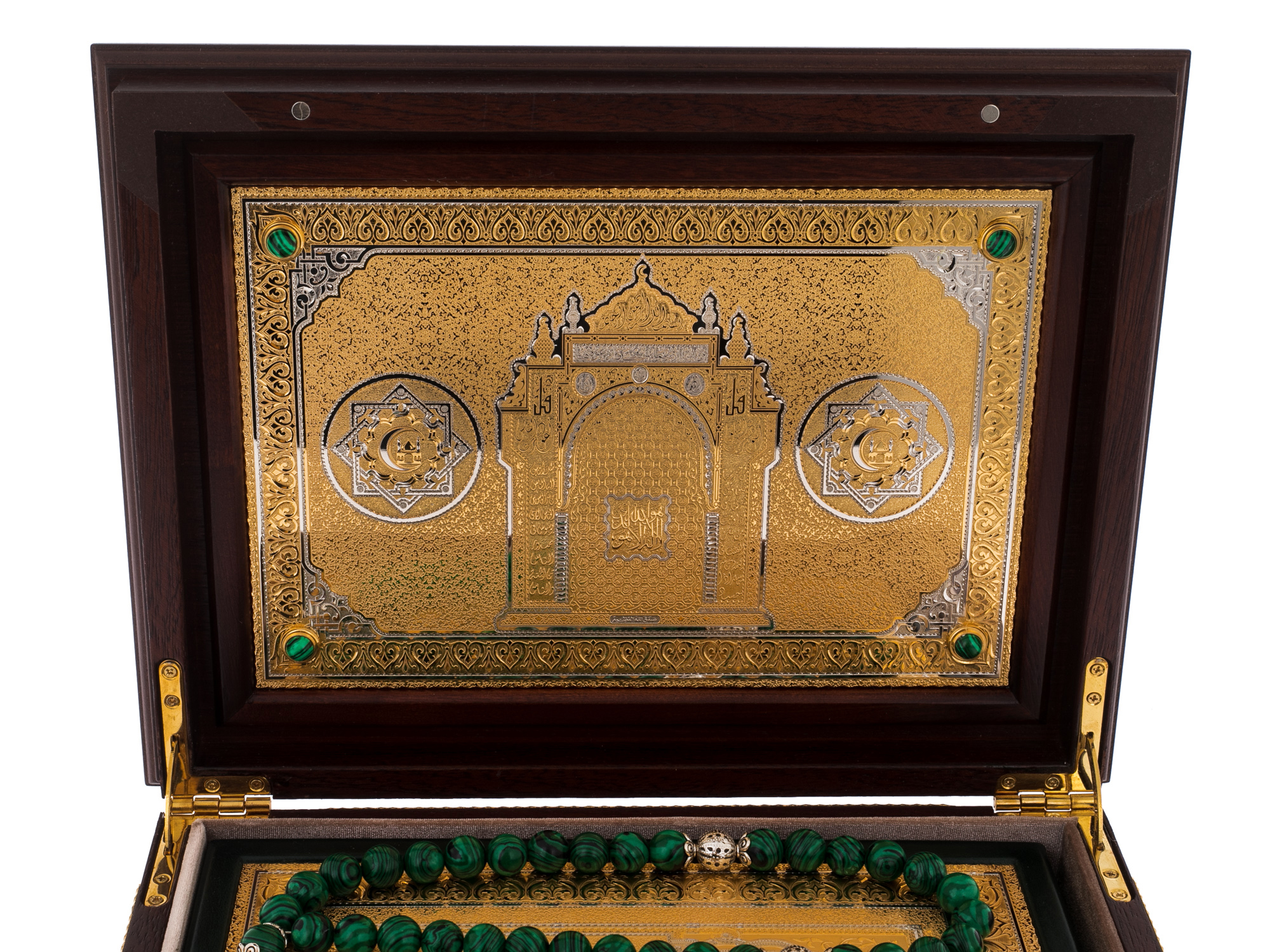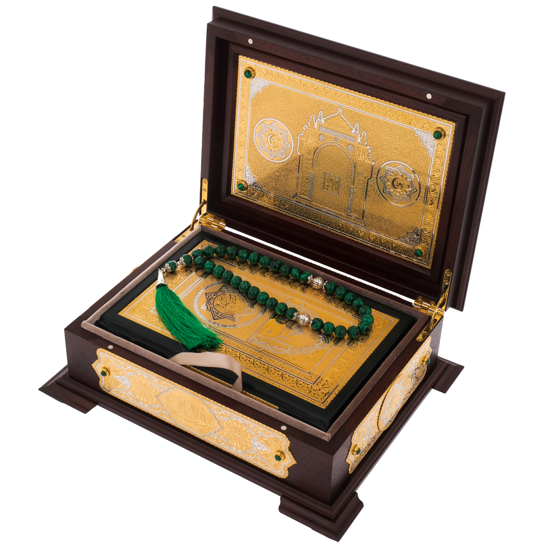 Мастера Златоуста соблюли все каноны главной религии мусульман. Общей концепции издания отвечает и нанесённая на обложке арабская вязь, и символы на золочёном окладе. В комплекте идут изумрудного цвета чётки. Переплёт из натуральной кожи декорирован накладками с золотым покрытием 999 пробы поверх латунного основания. Филигранная гравировка ручной работы резцом и иглой подверглась травлению в печи для придания выразительности и объём за счёт чередования матовых и глянцевых участков. Ларец из натурального ореха позволяет хранить Коран, как настоящий музейный экспонат. Он инкрустирован зелёным камнем, органично контрастирующим с цветом дерева и золотом.