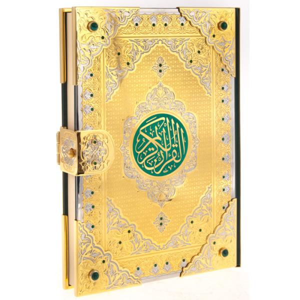 АльтмастерКоран "Великолепие" на арабском языкеКоран "Великолепие" на арабском языкеОригинальное издание Священного Корана на арабском языке выполнено в окладе из слиткового серебра. Переплет из тонкой телячьей кожи глубокого зеленого цвета вручную инкрустирован объемными серебряными вставками и расписан в технике горячей эмали. Цвет кожи выбран не случайно, он выступает как символ райских садов, молодости и изобилия. Лицевую сторону оклада украшает надпись «Священный Коран», которая выполнена арабской вязью и помещена в розетку небесно-голубого цвета. Все элементы инкрустации богато украшены растительным орнаментом — ислими. Выбор подобного оформления продиктован исламской традицией – передавать красоту форм через каллиграфию печатного слова и использование растительных орнаментов в декоре, не изображая при этом одушевленных предметов. Смысл использования бесконечно переплетающихся узоров, лежит в абстрактном видении явлений в исламе, и призван направить человека к пониманию бесконечного в конечных формах. Оклад дополнен серебряными уголками и фигурной застежкой, украшенной камнем.