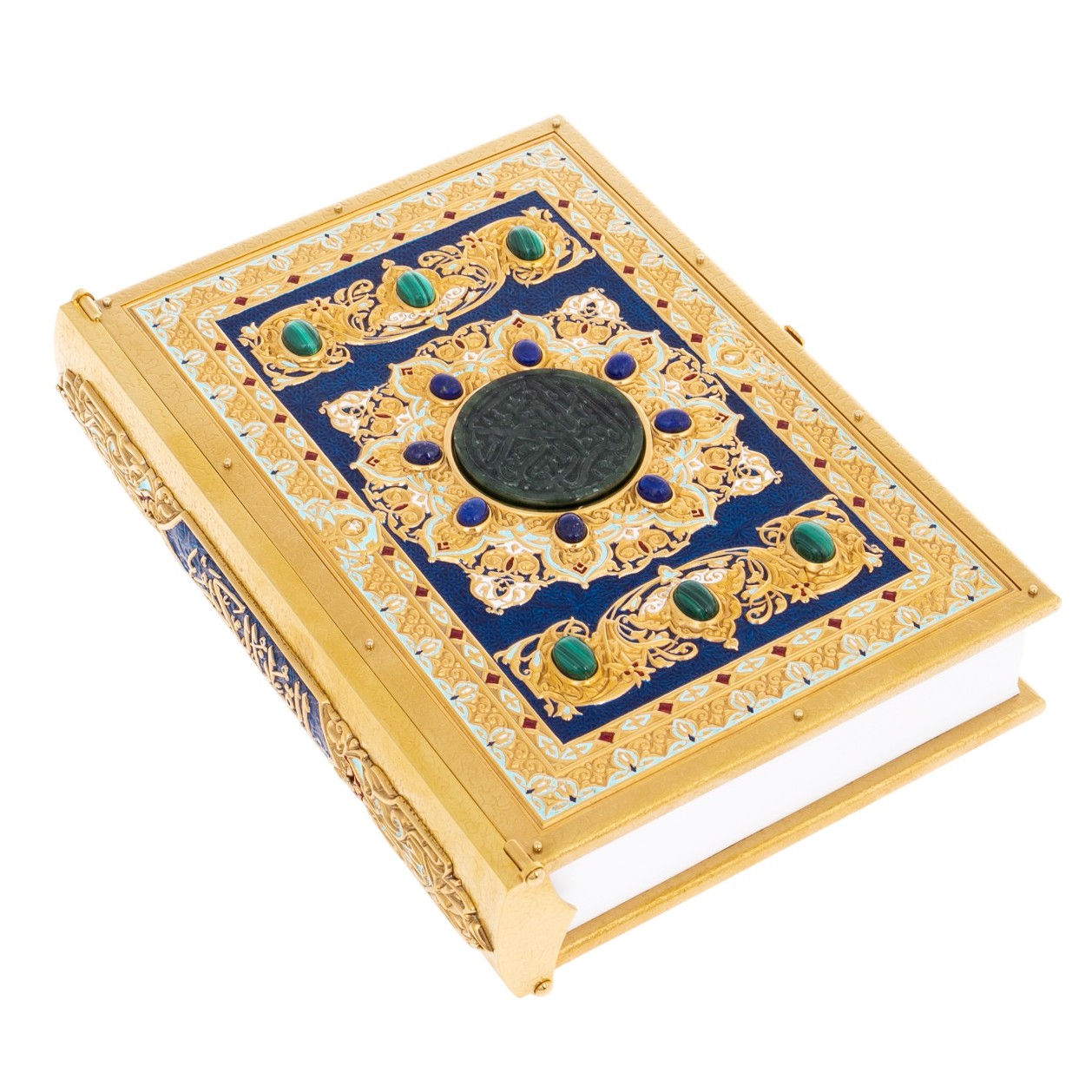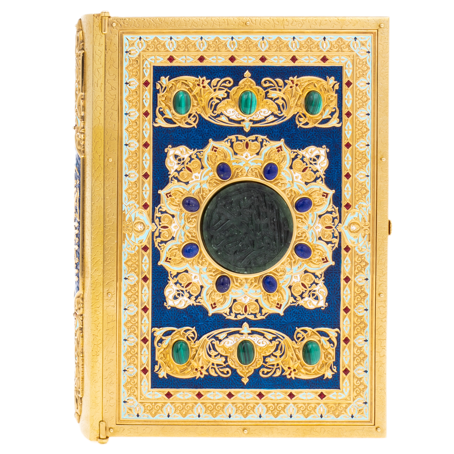 Этот Коран — величественное олицетворение духовной и материальной ценности, созданное искусными мастерами Златоуста. Окутанный роскошью и выполненный с необыкновенной тщательностью, он воплощает древние традиции, привнося в мир своего обладателя не только силу веры, но и мощь изысканного искусства. Сочетание нефрита и золота открывает символическую связь с землей и небом, становясь мостом между физическим и духовным.
