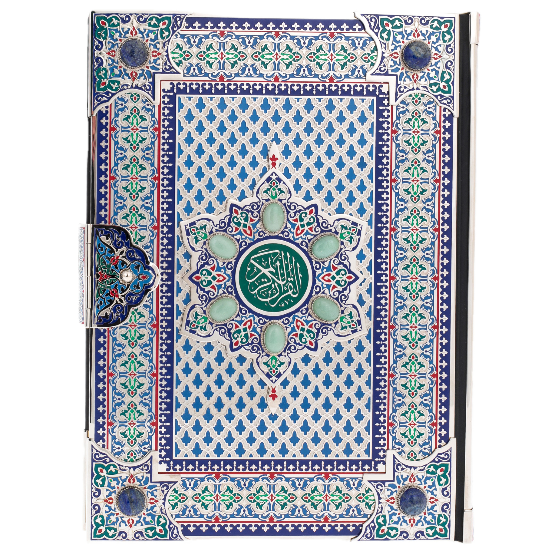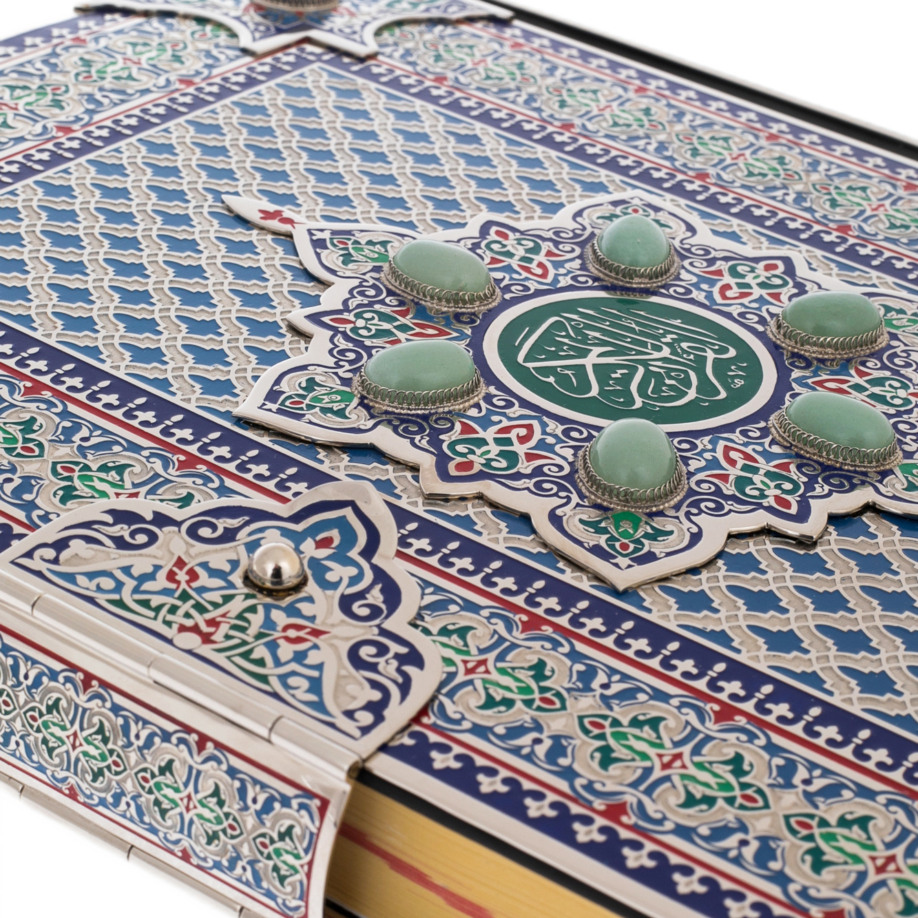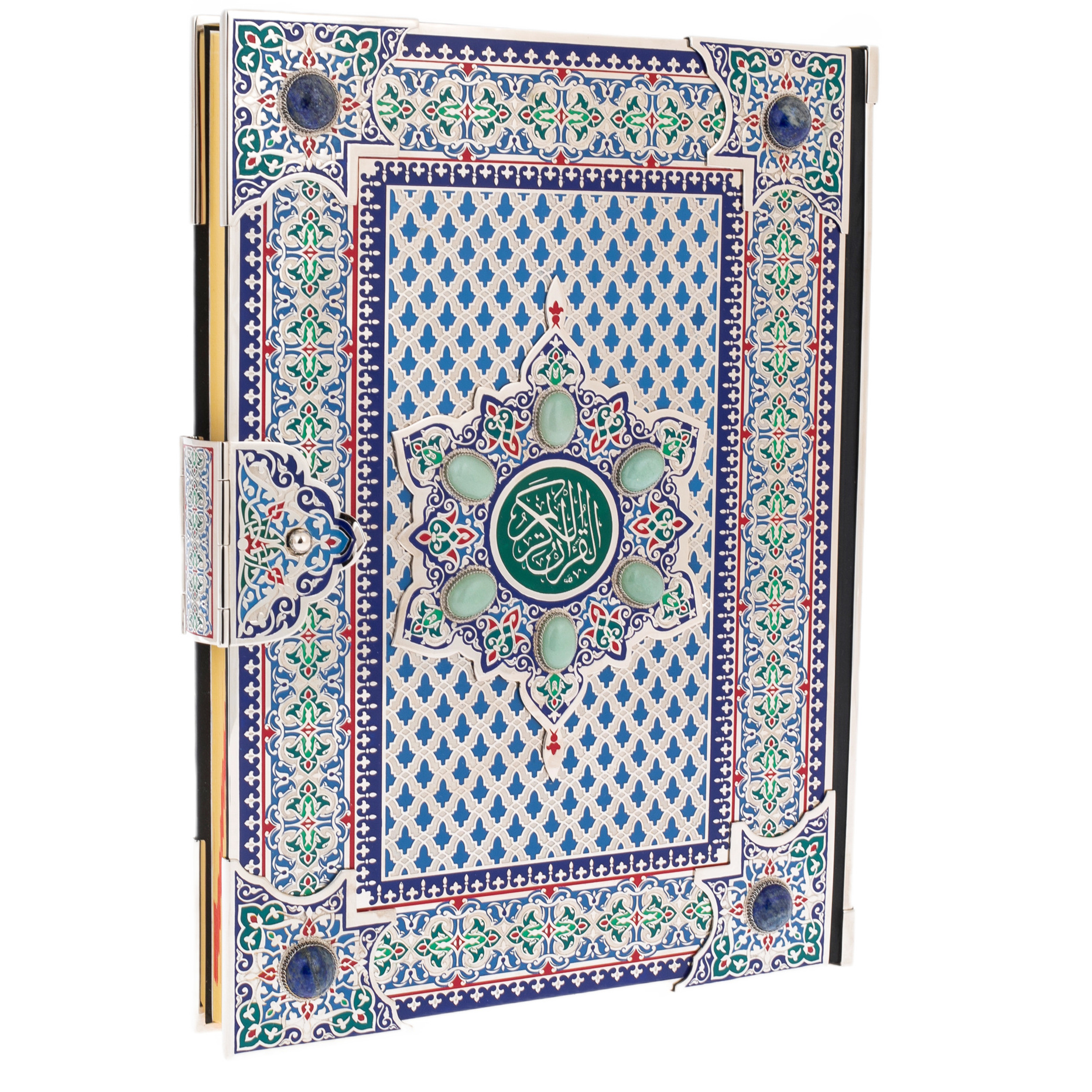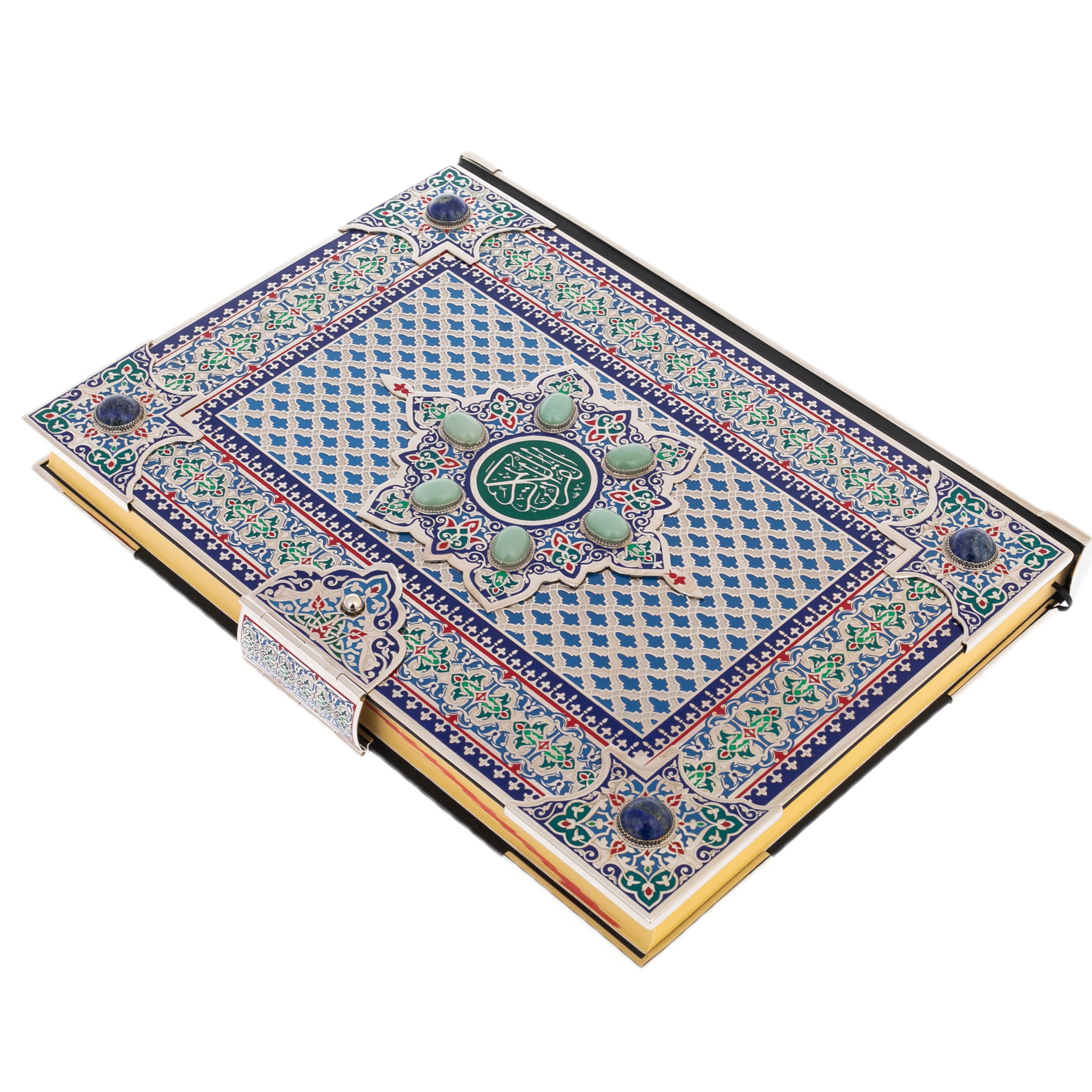В центре композиции — медальон с каллиграфическим письмом, окруженный натуральными вставками из авантюрина. Этот камень с мягким, мерцающим свечением символизирует мудрость, покой и глубину духовного мира. Он будто хранит в себе тайну тысячелетий, подобно древним рукописям, передающим истину через поколения. Чеканка по металлу, подчёркнутая тончайшим тиснением, делает обложку подлинным произведением искусства, сравнимым с восточными мозаиками, украшающими стены древних дворцов. Здесь нет ничего случайного — каждый элемент орнамента несет в себе скрытую символику, создавая ощущение целостности и завершённости.