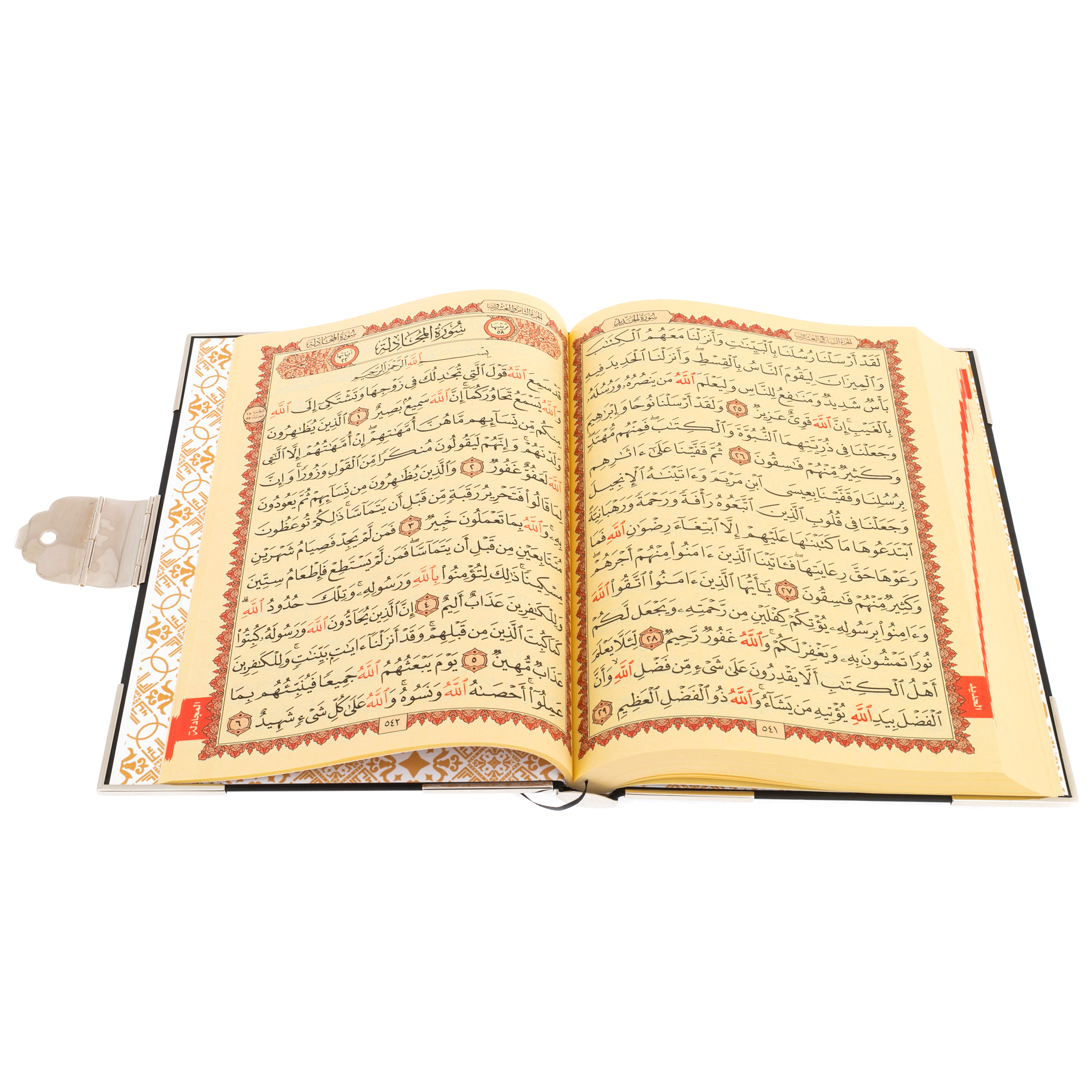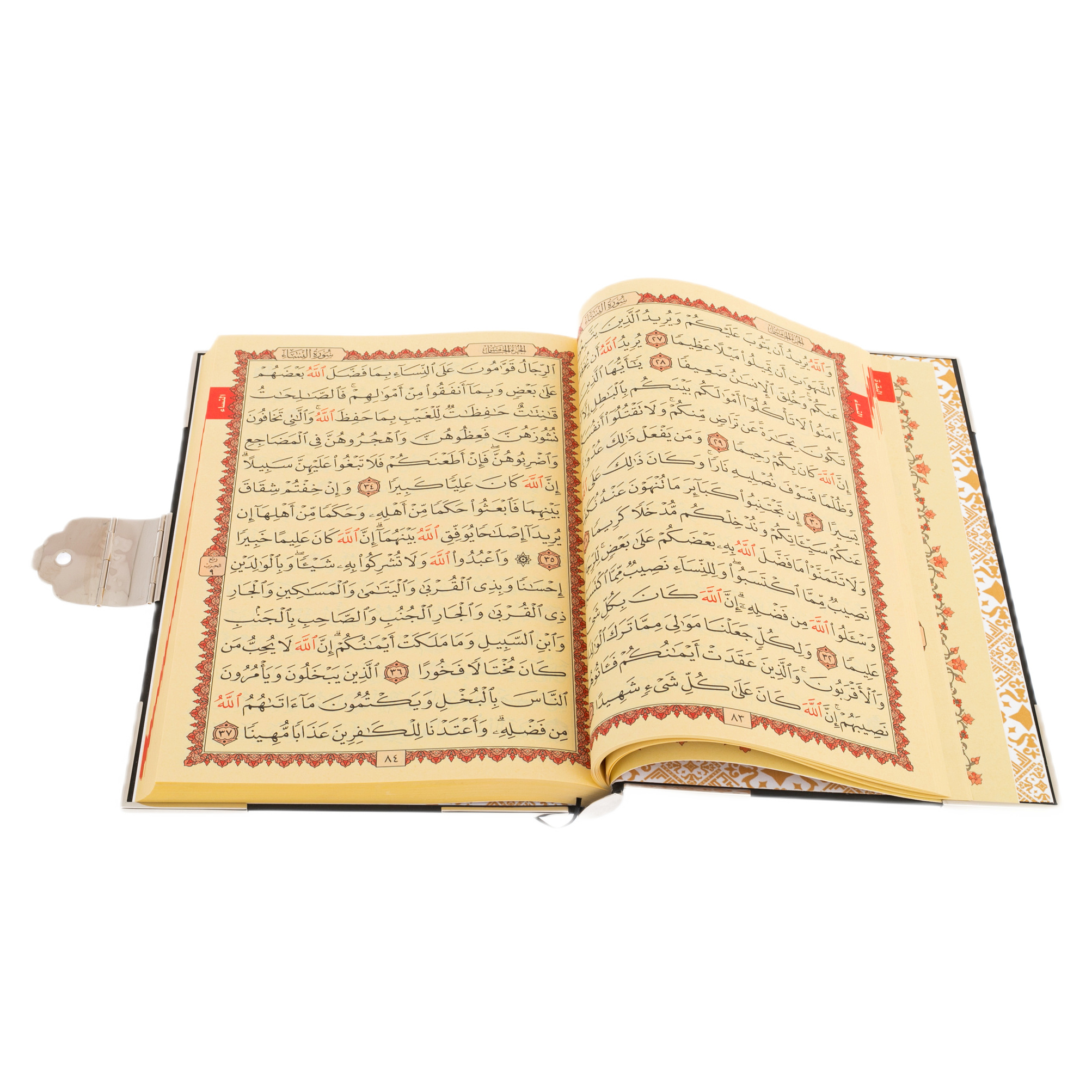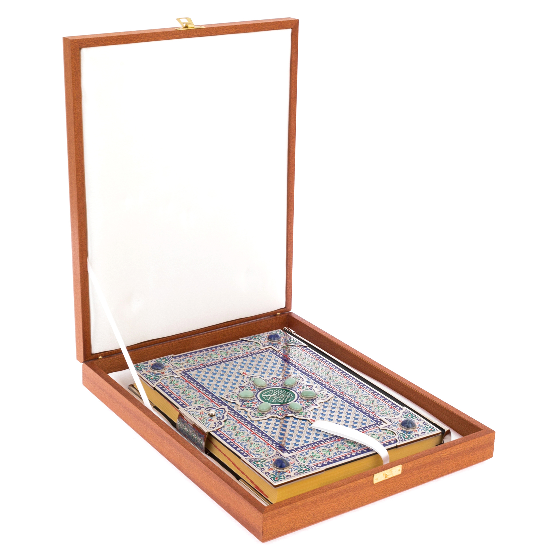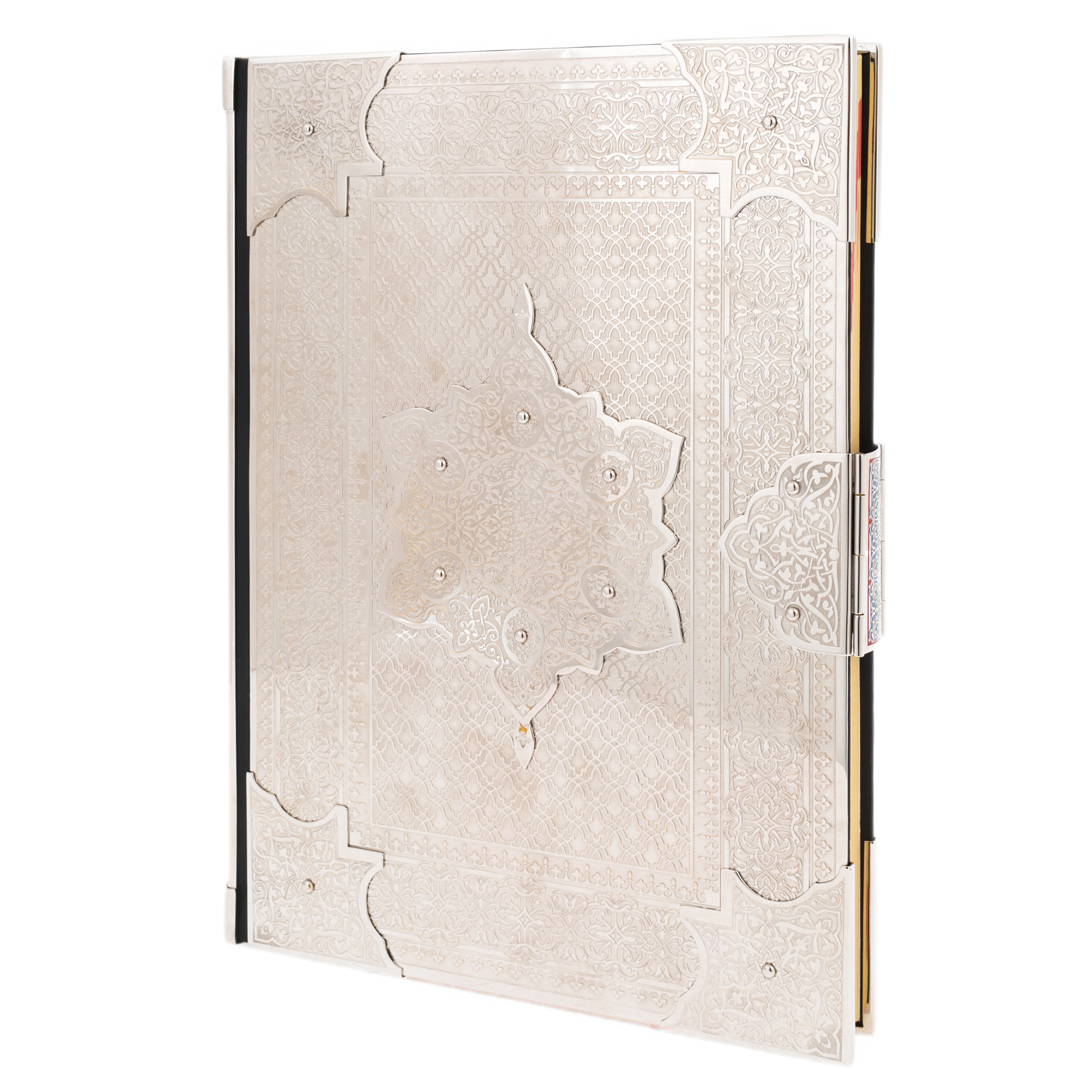 В центре композиции — медальон с каллиграфическим письмом, окруженный натуральными вставками из авантюрина. Этот камень с мягким, мерцающим свечением символизирует мудрость, покой и глубину духовного мира. Он будто хранит в себе тайну тысячелетий, подобно древним рукописям, передающим истину через поколения. Чеканка по металлу, подчёркнутая тончайшим тиснением, делает обложку подлинным произведением искусства, сравнимым с восточными мозаиками, украшающими стены древних дворцов. Здесь нет ничего случайного — каждый элемент орнамента несет в себе скрытую символику, создавая ощущение целостности и завершённости.