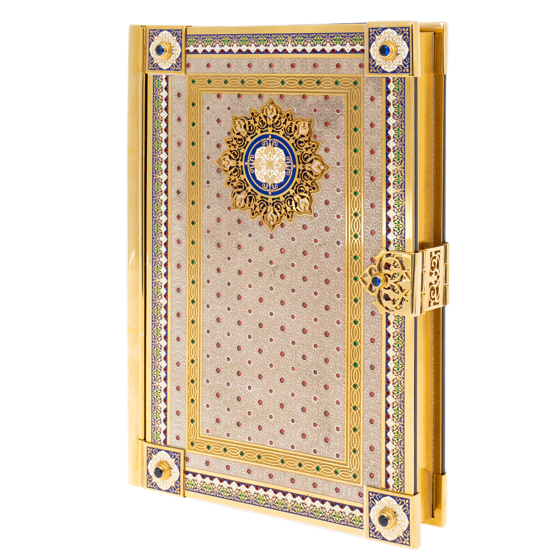 Декор выполнен в знаменитой златоустовской технике, которая славится филигранной гравировкой и применением горячей эмали на металле. Мастера Златоуста создают уникальные узоры и орнаменты с использованием благородных металлов и ярких красок, что придаёт книге неповторимый внешний вид и ощущение глубокой традиции. Особое внимание уделено деталям: изящный металлический замок, филигранные элементы и тонкая работа с цветом делают издание настоящим произведением ювелирного искусства.