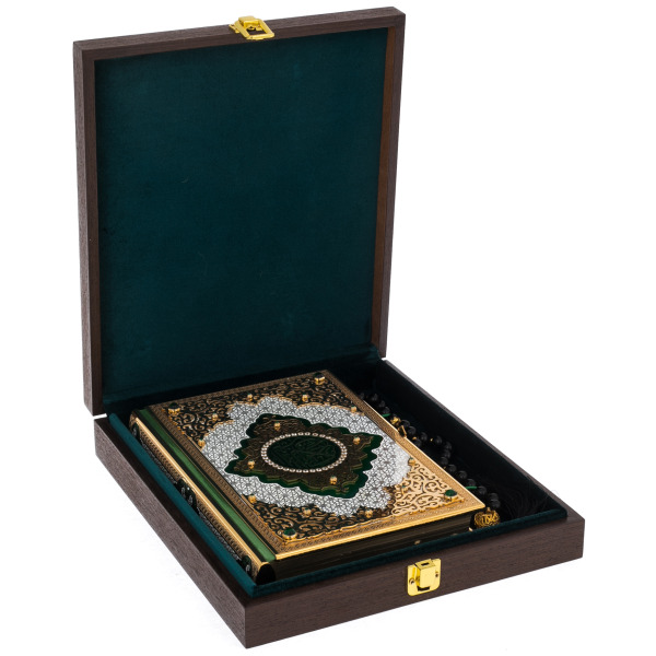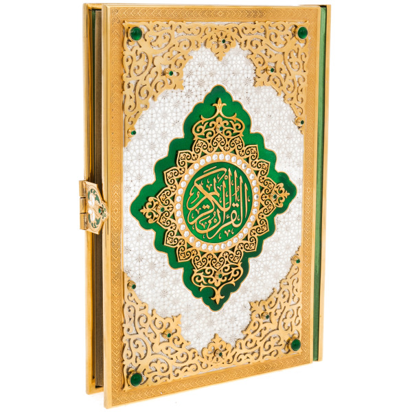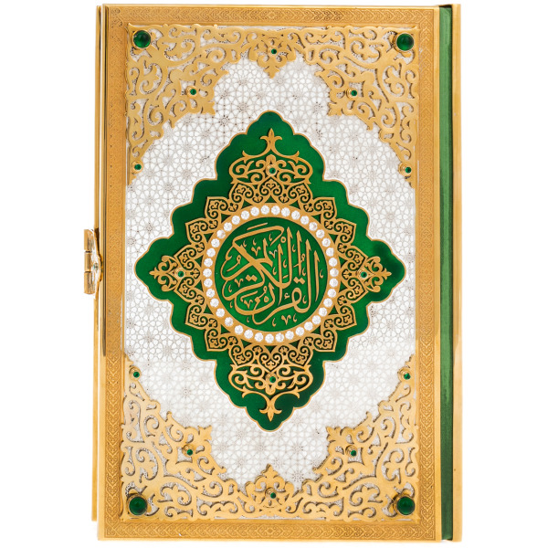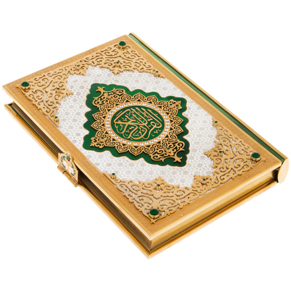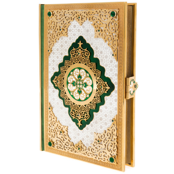 АльтмастерКоран "Великолепие" на арабском языкеКоран "Великолепие" на арабском языкеОригинальное издание Священного Корана на арабском языке выполнено в окладе из слиткового серебра. Переплет из тонкой телячьей кожи глубокого зеленого цвета вручную инкрустирован объемными серебряными вставками и расписан в технике горячей эмали. Цвет кожи выбран не случайно, он выступает как символ райских садов, молодости и изобилия. Лицевую сторону оклада украшает надпись «Священный Коран», которая выполнена арабской вязью и помещена в розетку небесно-голубого цвета. Все элементы инкрустации богато украшены растительным орнаментом — ислими. Выбор подобного оформления продиктован исламской традицией – передавать красоту форм через каллиграфию печатного слова и использование растительных орнаментов в декоре, не изображая при этом одушевленных предметов. Смысл использования бесконечно переплетающихся узоров, лежит в абстрактном видении явлений в исламе, и призван направить человека к пониманию бесконечного в конечных формах. Оклад дополнен серебряными уголками и фигурной застежкой, украшенной камнем.