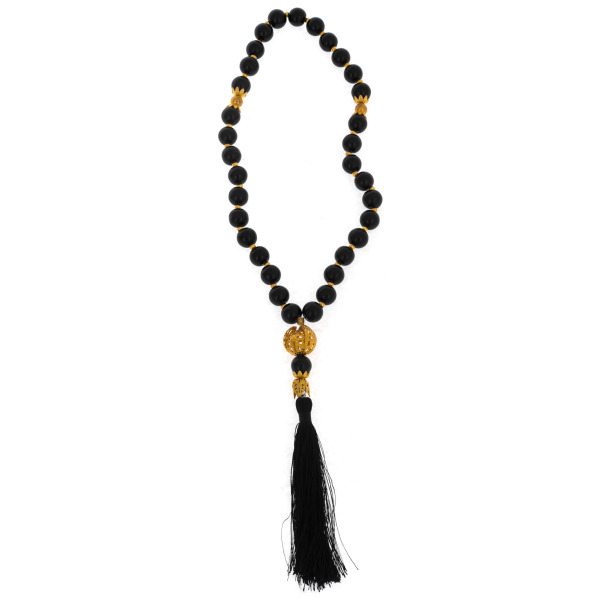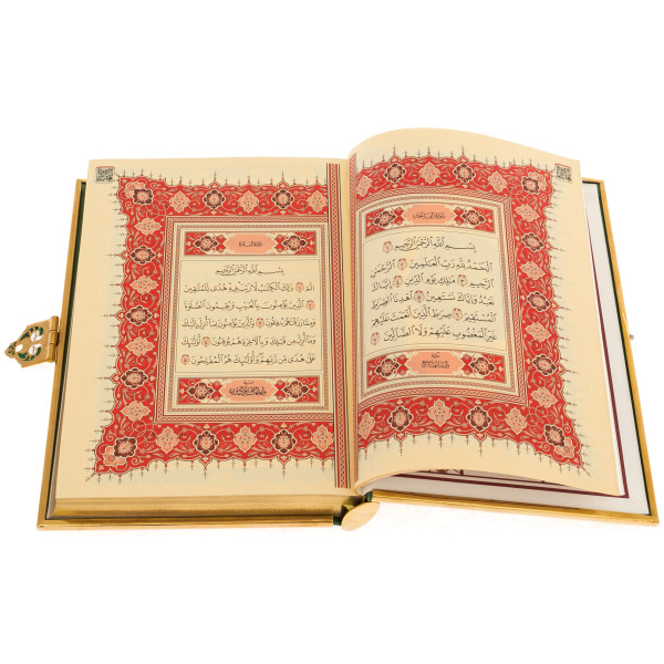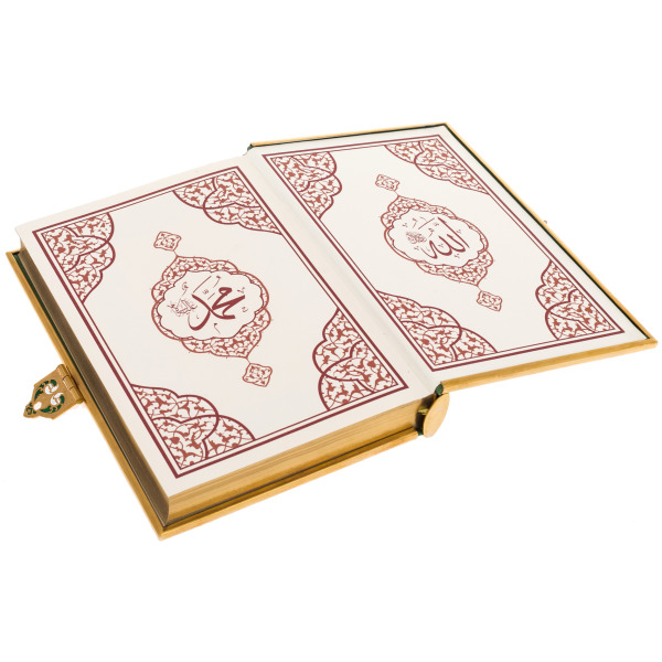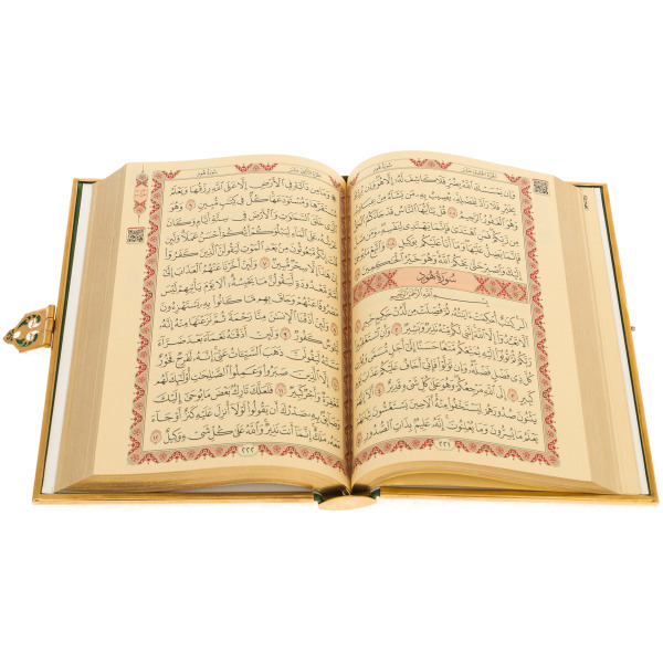 Коран снабжён замком-застёжкой, обрамлением из золочёной латуни и изысканными деталями, отсылающими к архитектуре Востока. В комплект входит чётки из чёрного камня с элементами позолоты — неотъемлемый атрибут мусульманской молитвенной практики, подчёркивающий сакральность подарка. Страницы выполнены из качественной бумаги, текст легко читаем, а оформление выдержано в лучших традициях каллиграфии.