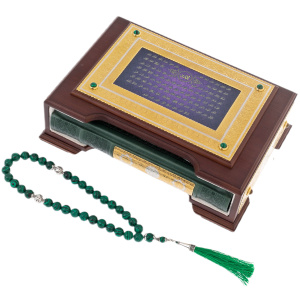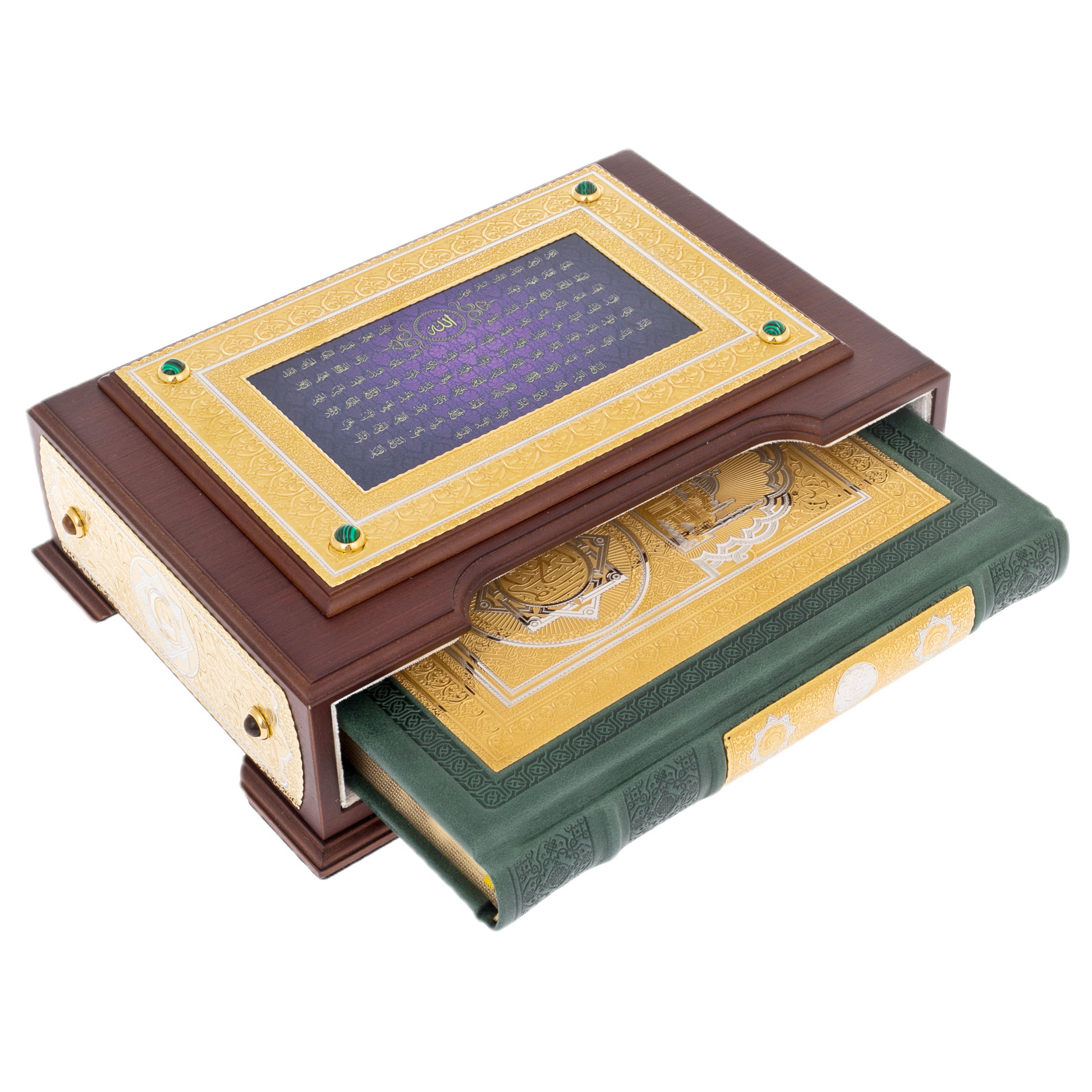 Футляр из благородного дерева, украшенный резными золотыми узорами, хранит в себе книгу, которая становится центром внимания, стоит только открыть крышку. Гравировка на поверхности, выполненная с тончайшей точностью, словно рассказывает древнюю историю, связывающую прошлое и настоящее, мудрость поколений и взгляд в будущее. В центре орнамента — зелёное полотно с арабской каллиграфией, являющееся не только эстетическим украшением, но и глубоким символом вечной жизни и мира.