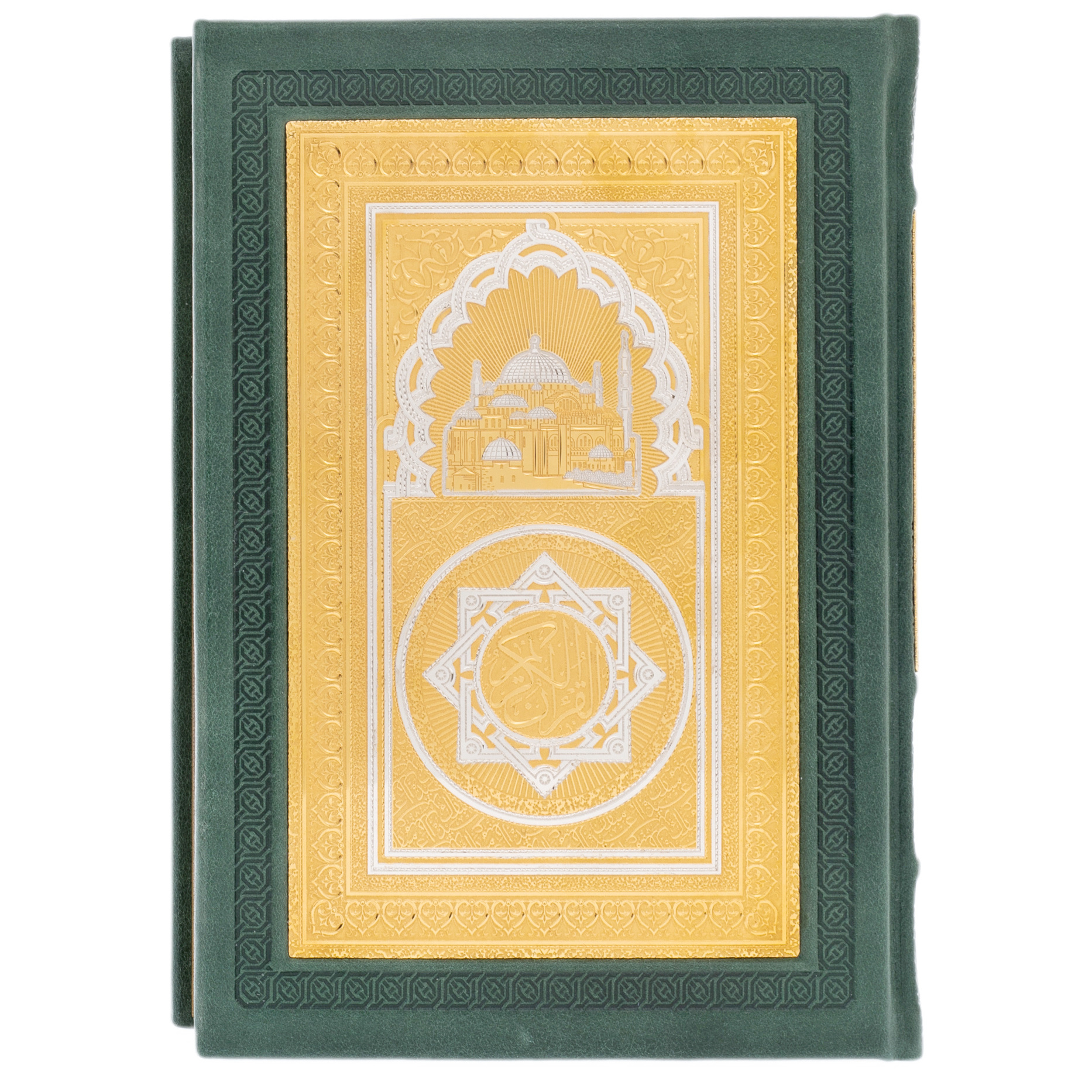 АльтмастерКоран "Великолепие" на арабском языкеКоран "Великолепие" на арабском языкеОригинальное издание Священного Корана на арабском языке выполнено в окладе из слиткового серебра. Переплет из тонкой телячьей кожи глубокого зеленого цвета вручную инкрустирован объемными серебряными вставками и расписан в технике горячей эмали. Цвет кожи выбран не случайно, он выступает как символ райских садов, молодости и изобилия. Лицевую сторону оклада украшает надпись «Священный Коран», которая выполнена арабской вязью и помещена в розетку небесно-голубого цвета. Все элементы инкрустации богато украшены растительным орнаментом — ислими. Выбор подобного оформления продиктован исламской традицией – передавать красоту форм через каллиграфию печатного слова и использование растительных орнаментов в декоре, не изображая при этом одушевленных предметов. Смысл использования бесконечно переплетающихся узоров, лежит в абстрактном видении явлений в исламе, и призван направить человека к пониманию бесконечного в конечных формах. Оклад дополнен серебряными уголками и фигурной застежкой, украшенной камнем.