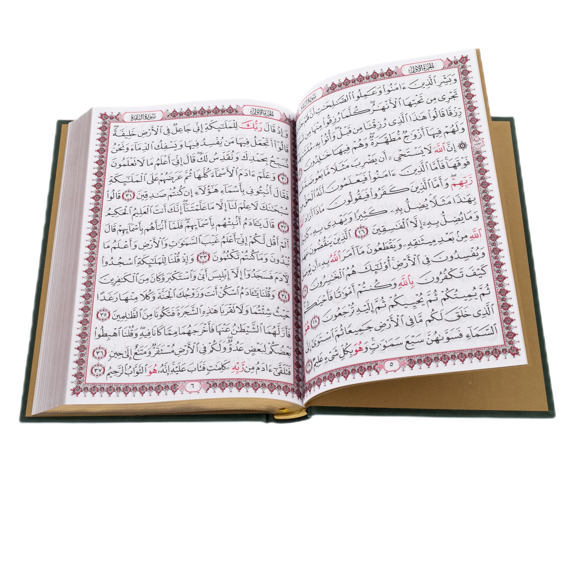 Книга открывается перед вами, словно раскрывающийся цветок — страницы украшены изысканными узорами, каждая строка текста обрамлена тонкой рамкой, где каждый символ будто дышит. Зеленая кожа переплета мягко переливается под светом, а золотое тиснение добавляет ощущение величественности и божественной гармонии.