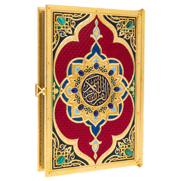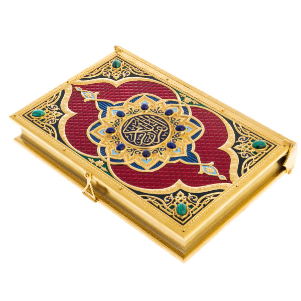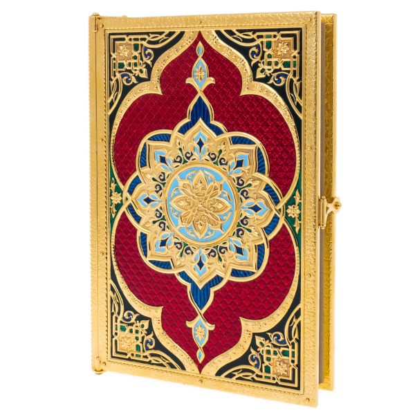 АльтмастерКоран "Великолепие" на арабском языкеКоран "Великолепие" на арабском языкеОригинальное издание Священного Корана на арабском языке выполнено в окладе из слиткового серебра. Переплет из тонкой телячьей кожи глубокого зеленого цвета вручную инкрустирован объемными серебряными вставками и расписан в технике горячей эмали. Цвет кожи выбран не случайно, он выступает как символ райских садов, молодости и изобилия. Лицевую сторону оклада украшает надпись «Священный Коран», которая выполнена арабской вязью и помещена в розетку небесно-голубого цвета. Все элементы инкрустации богато украшены растительным орнаментом — ислими. Выбор подобного оформления продиктован исламской традицией – передавать красоту форм через каллиграфию печатного слова и использование растительных орнаментов в декоре, не изображая при этом одушевленных предметов. Смысл использования бесконечно переплетающихся узоров, лежит в абстрактном видении явлений в исламе, и призван направить человека к пониманию бесконечного в конечных формах. Оклад дополнен серебряными уголками и фигурной застежкой, украшенной камнем.