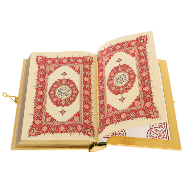 Полный текст Священного Корана из 114 глав напечатан в Турции на специальной бумаге «под папирус» и выполнен каллиграфическим шрифтом насх, распространенным во времена правления халифа Усмана. Имена Аллаха, ключевые фразы и места протяжного чтения выделены красным цветом.