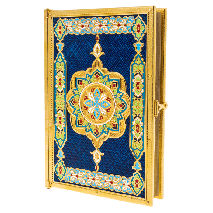 Тяжёлый переплёт сияет благородным блеском золочёного металла и глубоким синим фоном горячей эмали. В центре композиции — орнаментальное солнце, словно символ Божественного света, исходящего из священного слова. В его лучах сияют вставки из малахита — камня мудрости и внутреннего равновесия, чьи зелёные прожилки напоминают о вечной гармонии творения.