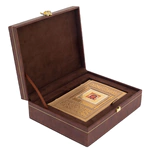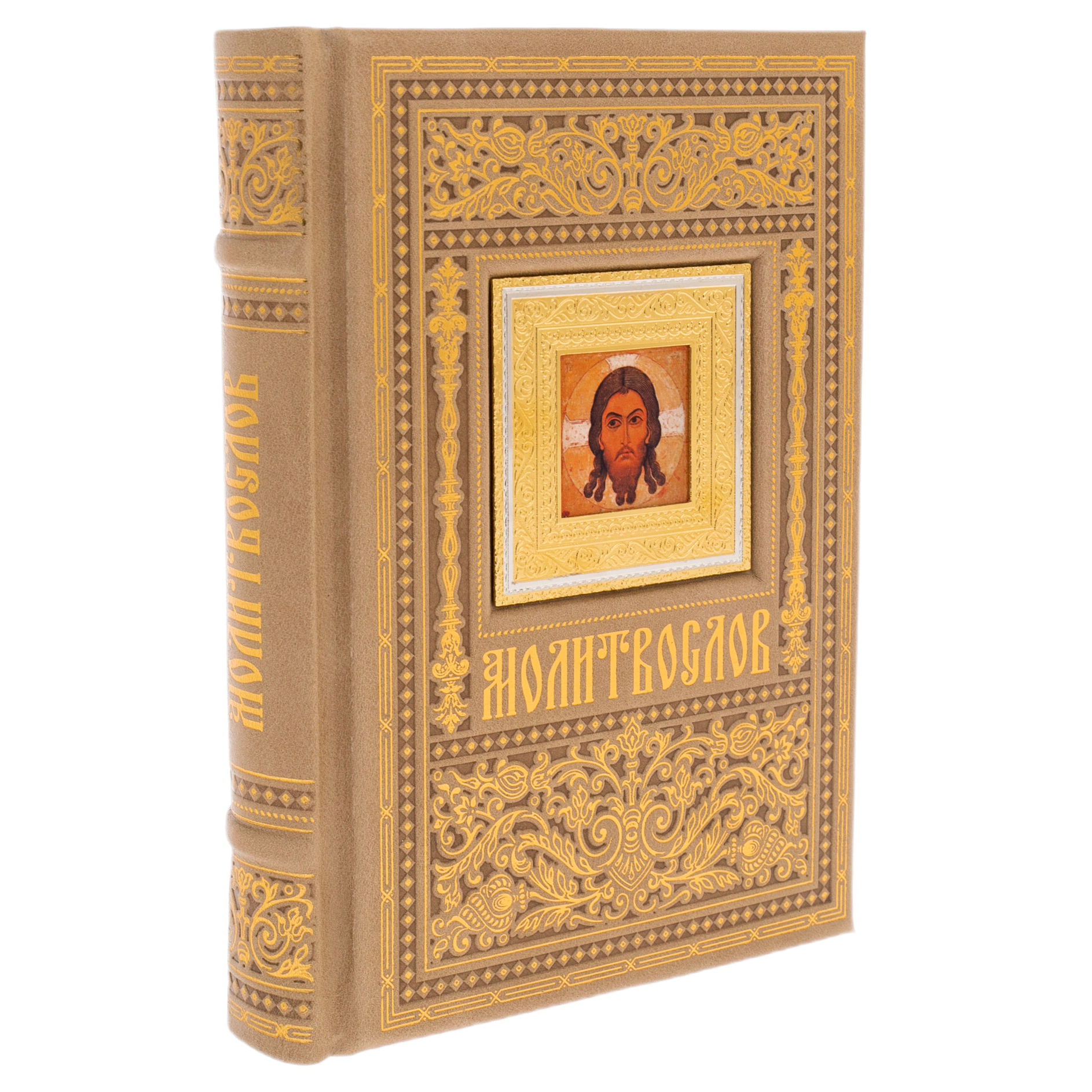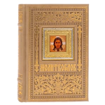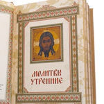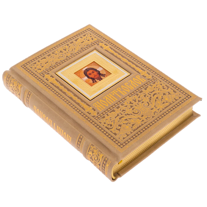 Молитвослов с инкрустацией пластиной в технике «миниатюрная живопись по эмали» — издание, в котором духовное содержание соединено с высокой культурой художественного оформления. Обложка выполнена в тёплой благородной гамме, украшена сложным орнаментом с золочением и центральной вставкой — миниатюрным изображением Спаса Нерукотворного, заключённым в декоративную рамку. Композиция выстроена с особой точностью: симметрия орнаментов, глубина тиснения и мягкость фактуры создают ощущение цельности и внутреннего достоинства предмета.